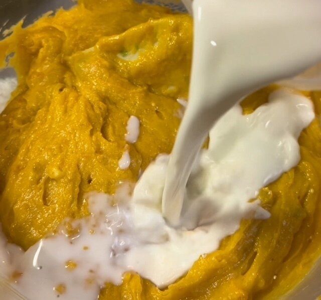 多少かぼちゃのつぶ感が残っていてもOK。よく混ぜたところに