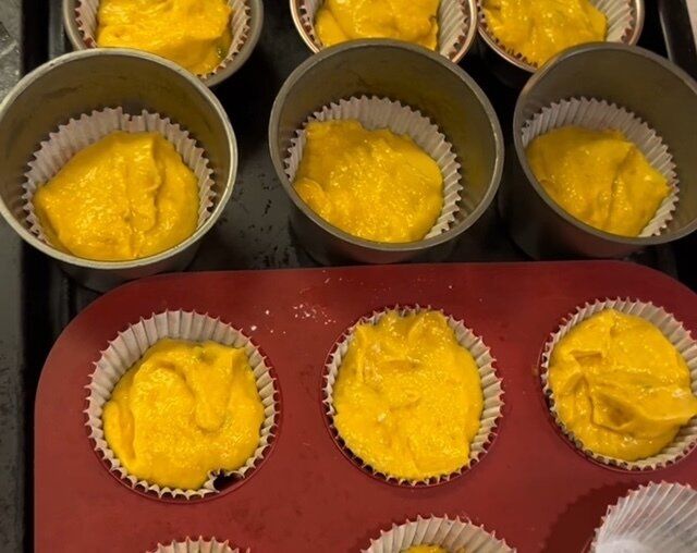 マフィン型にカップやアルミを敷き、そこへ生地を流す。生地はカップ8分目くらいがちょうど良い。