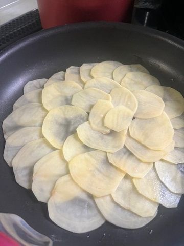 スライスしたじゃがいもをフライパンに円を描くように並べていきます。