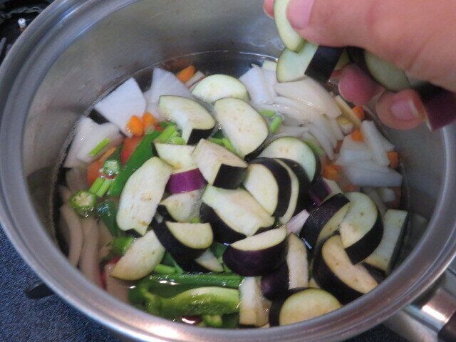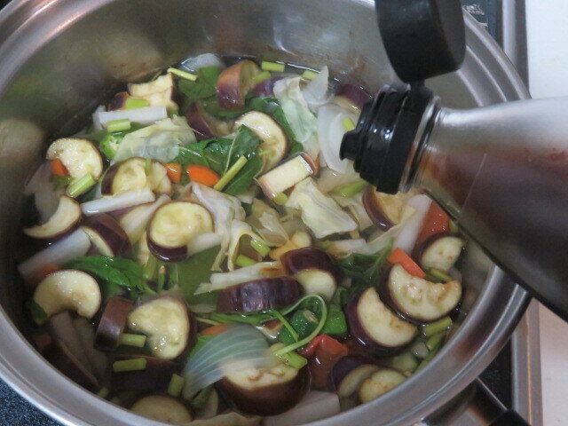 根菜類など火の通りにくいものから入れて、次に実のもの、最後に葉ものの野菜を加え1つの鍋で豪快に煮ます。