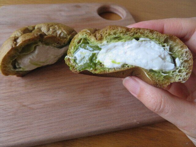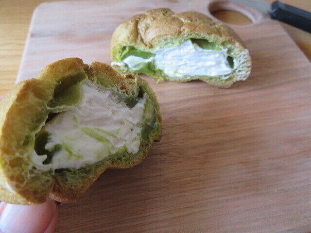 シュー生地にも抹茶が練り込まれているので、かすかに緑色を帯びたうぐいす色をしています。