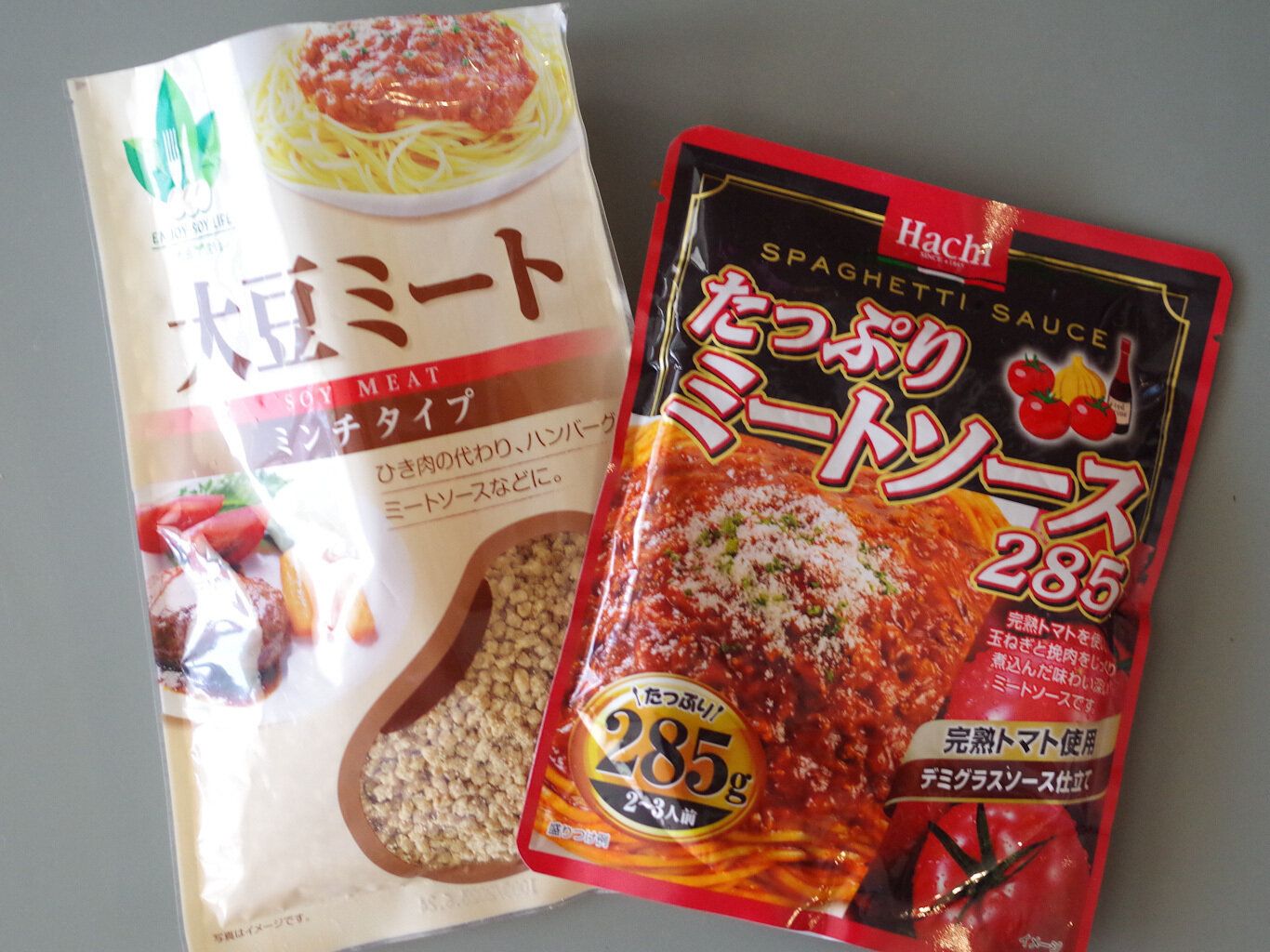 あっさりとしているのが物足りないと感じたら、挽肉入りの食品に混ぜてみても。キャンドゥで販売されている「たっぷりミートソース」は、挽肉入りなので自然に「かさ増し」ができます。なお、大豆ミート半量と1袋でちょうどいいバランスでした。