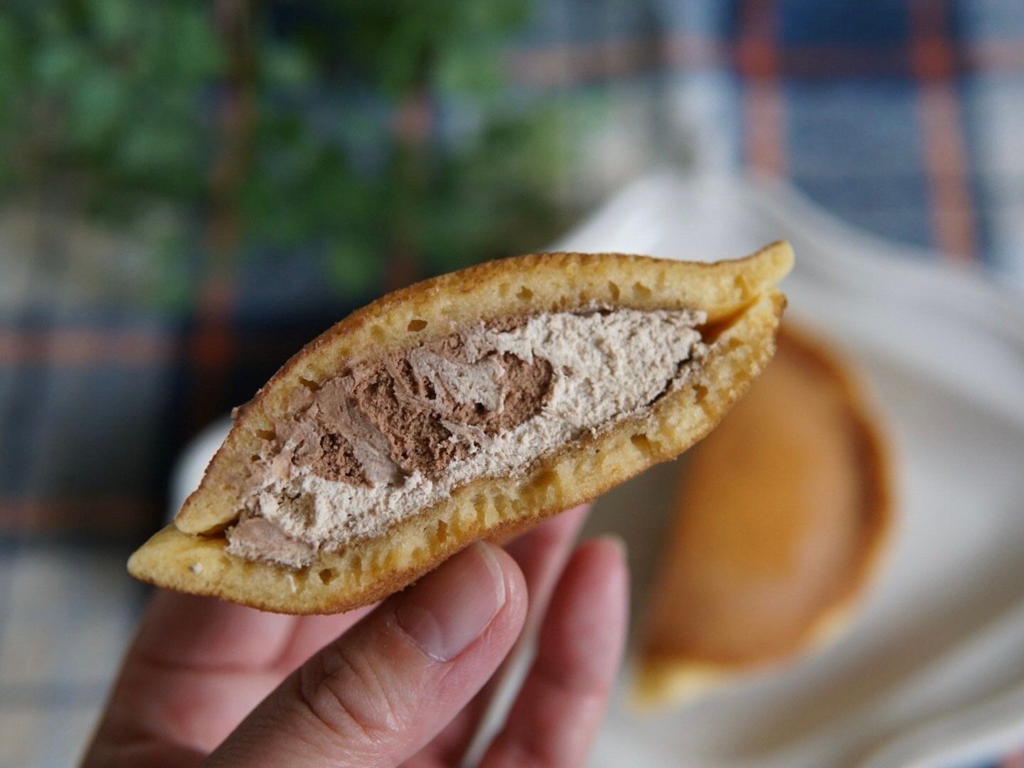 長いもが加えられており、もっちりとした食感が楽しめるどら焼き生地の中には、北海道産生クリームとカスタードクリームにコーヒーをあわせたコーヒークリームと、チョコレートペーストに生チョコレートをあわせたチョコクリームがぎっしりつめられ、中身がはみ出ないように、縁はしっかりと閉じられています。