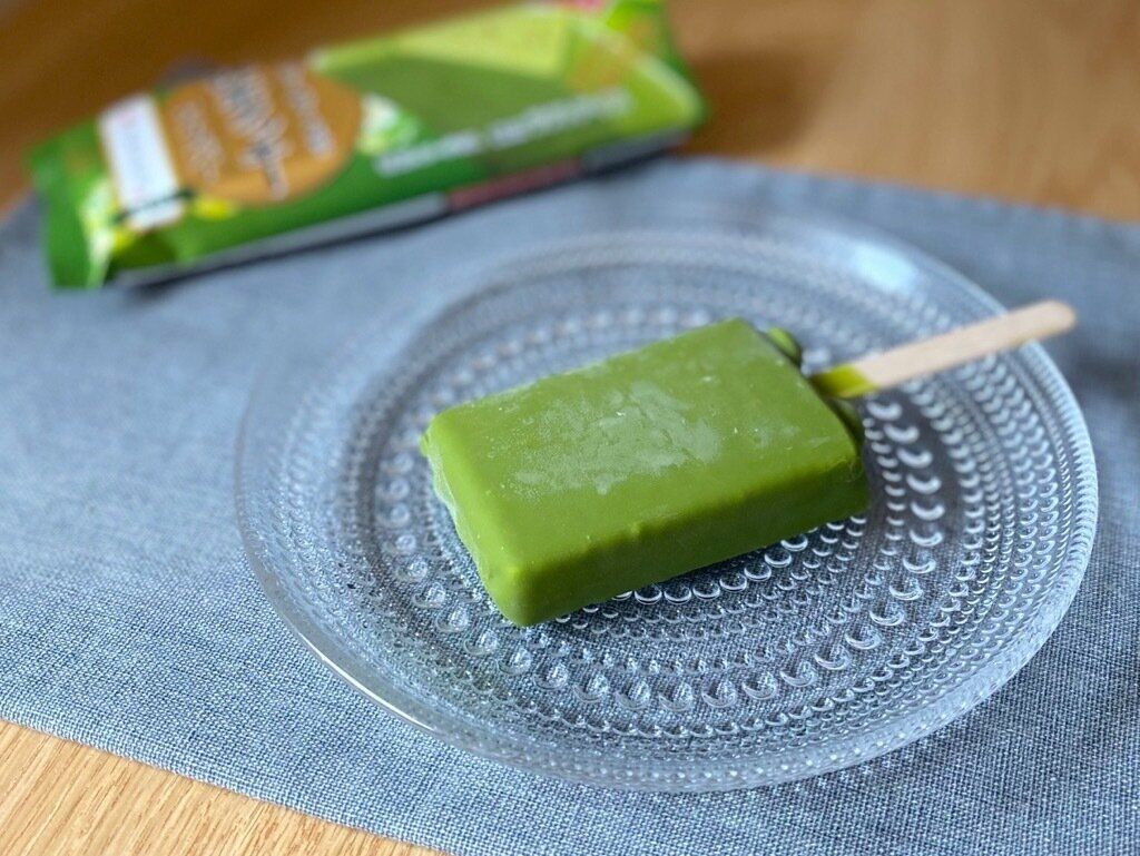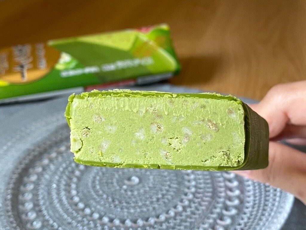 上品な抹茶の香りと濃厚な味わいを楽しめる「さくさく食感の抹茶クッキーアイスバー」。一般的なバーアイスよりやや小さめサイズですが満足度の高い商品でした。