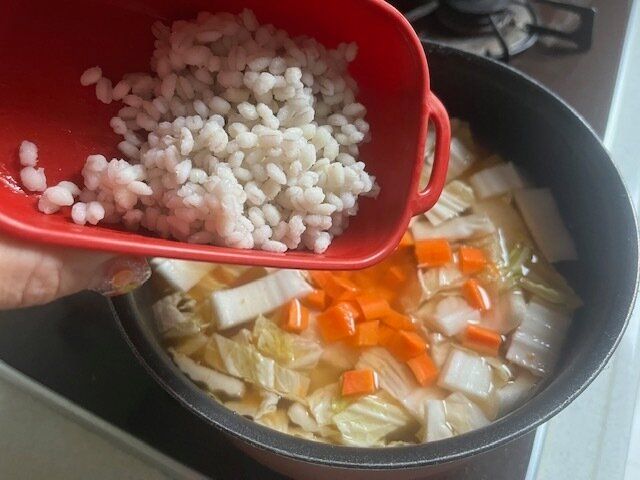 スープだけでは物足りないときなどに、「もち麦」が加わることでボリュームも出て