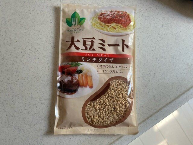こちらです!「大豆ミート」ミンチタイプ 税抜き100円。