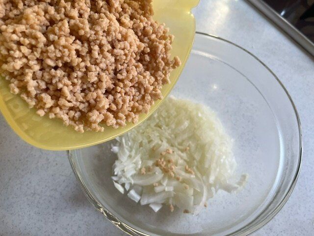 みじん切りのタマネギに大豆ミートを合わせていきます。