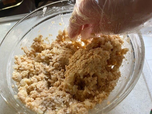 そのあと、塩コショウ、パン粉やたまごなどいつものように入れてあとはよく混ぜるだけ。