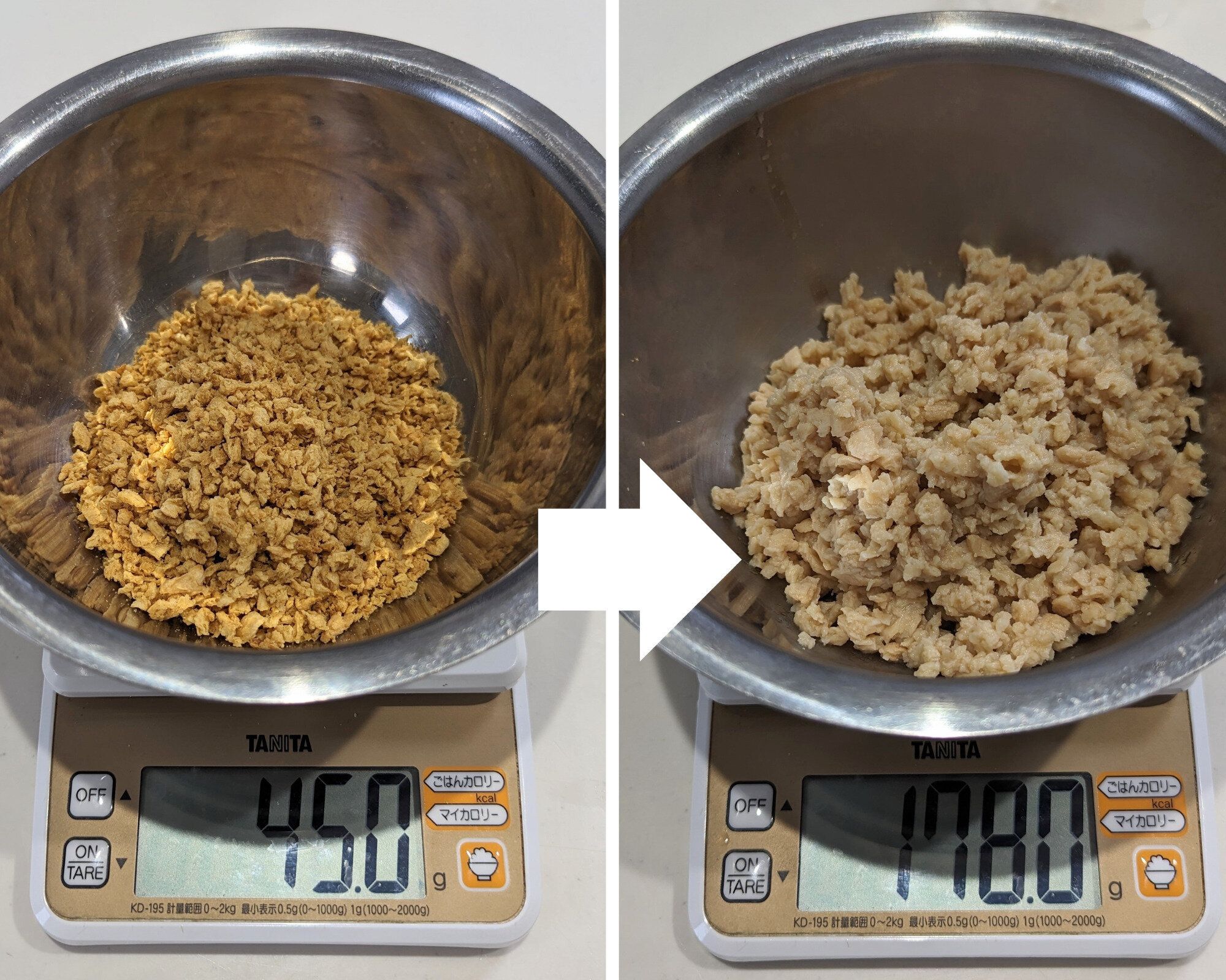 100gあたりで比べると、豚ひき肉のエネルギーが約200kcal、脂質17g、たんぱく質17gなのに対して、大豆ミートは約110kcal、脂質3g、たんぱく質14g。
