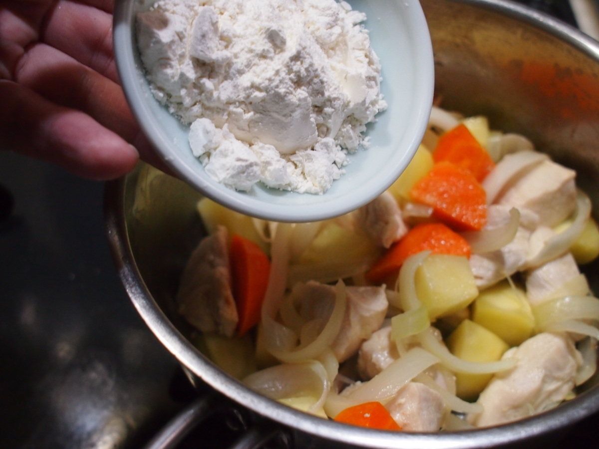 具材がよく炒められたら、大さじ2の小麦粉を入れます。ここで、ポイントなのが「必ず火を止めてから小麦粉を入れる」こと。