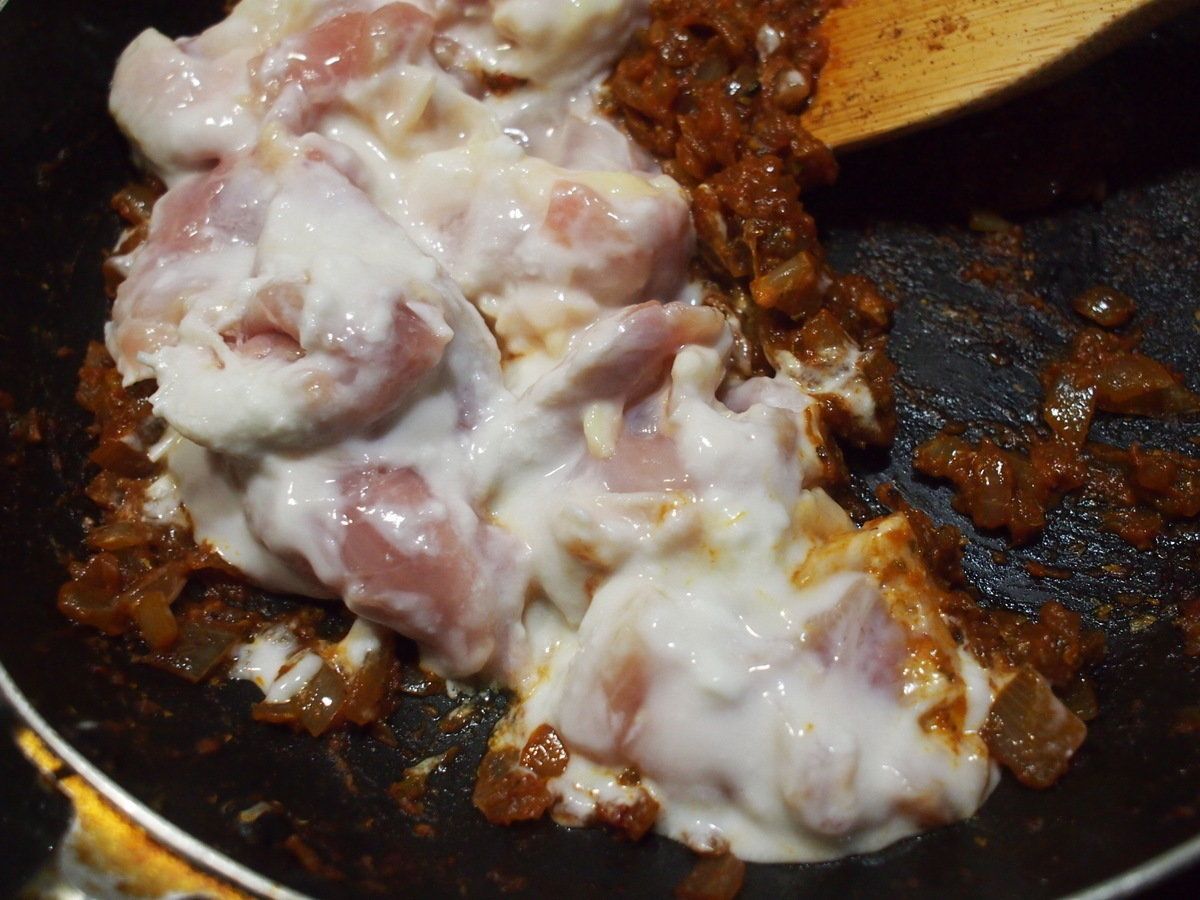 鶏もも肉はスーパーで買ってきたら、すぐにヨーグルト100ccと混ぜて冷蔵庫に入れておくといいでしょう。で、ヨーグルトとともに投入し、少し煮込みます。