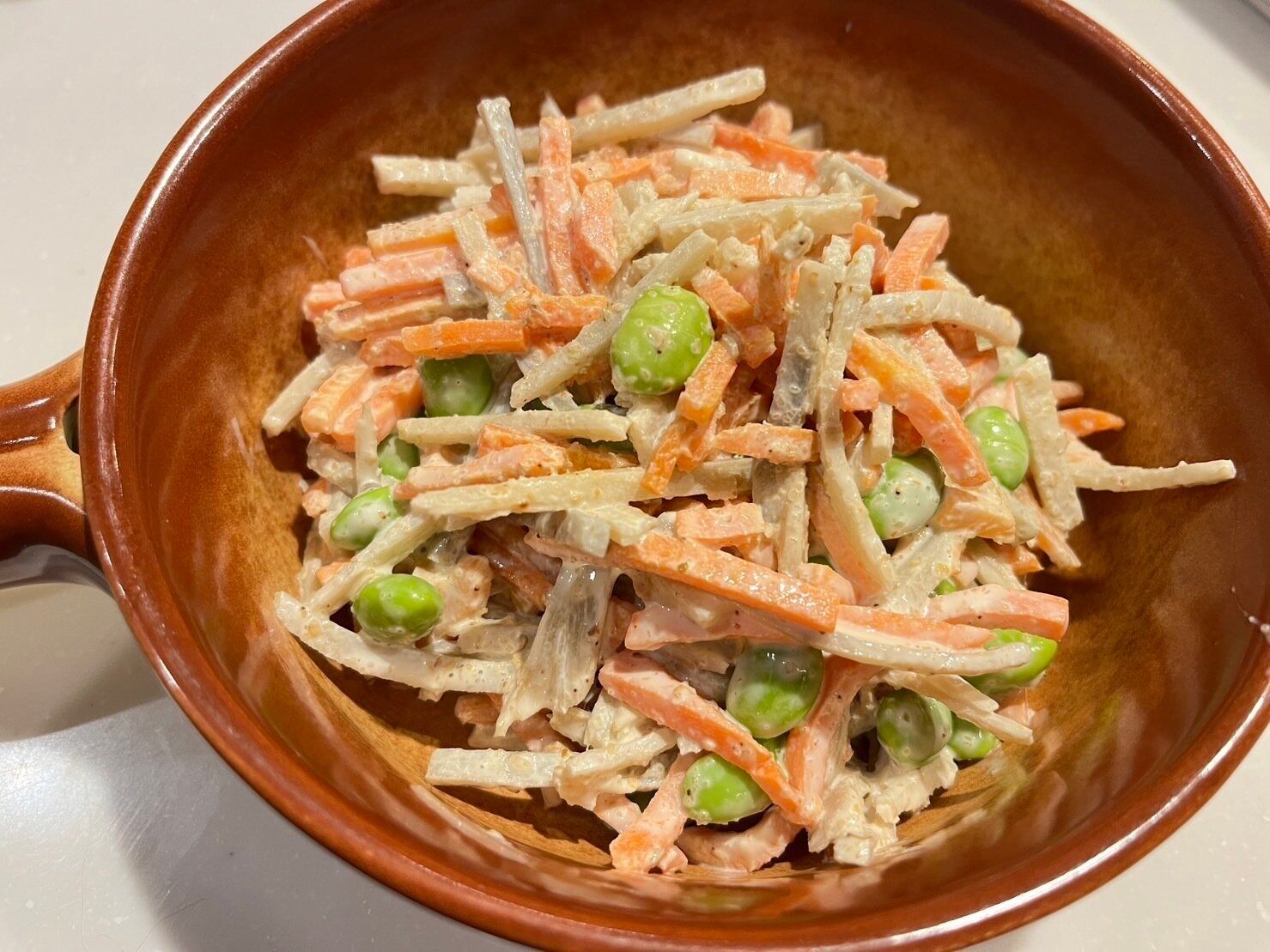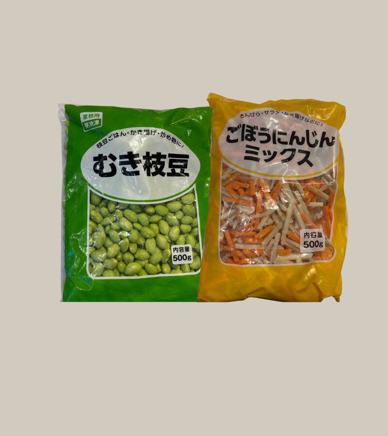 1.ごぼうにんじんミックス、むき枝豆を耐熱ボウルに入れラップをかけて600Wの電子レンジで4分加熱する。