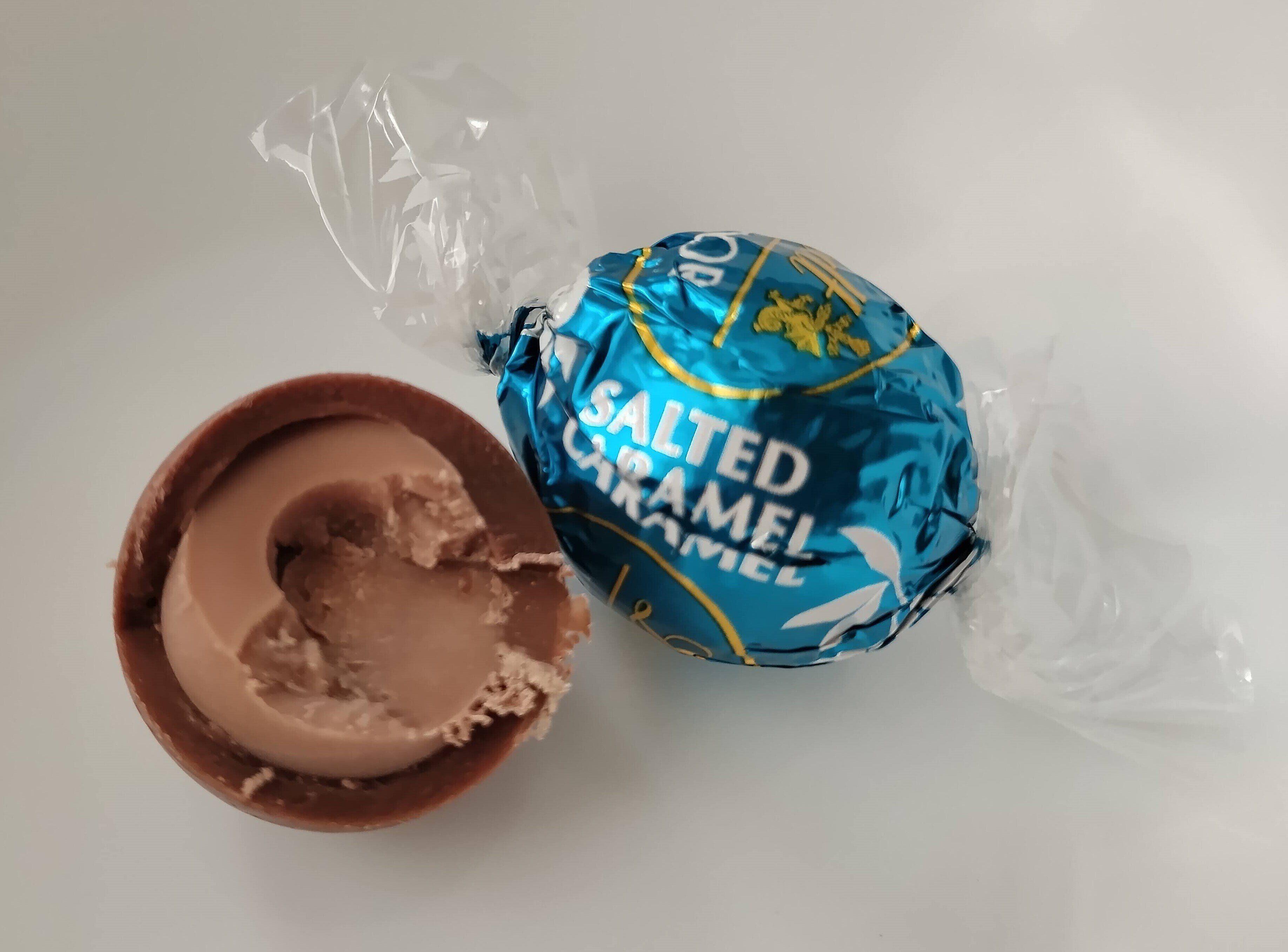 青い包み紙に包まれている「ソルテッドキャラメル」。ミルクチョコレートのシェルに塩キャラメル風味のフィリングが入っています。部分的にしょっぱいのが病みつきになるチョコレートです。