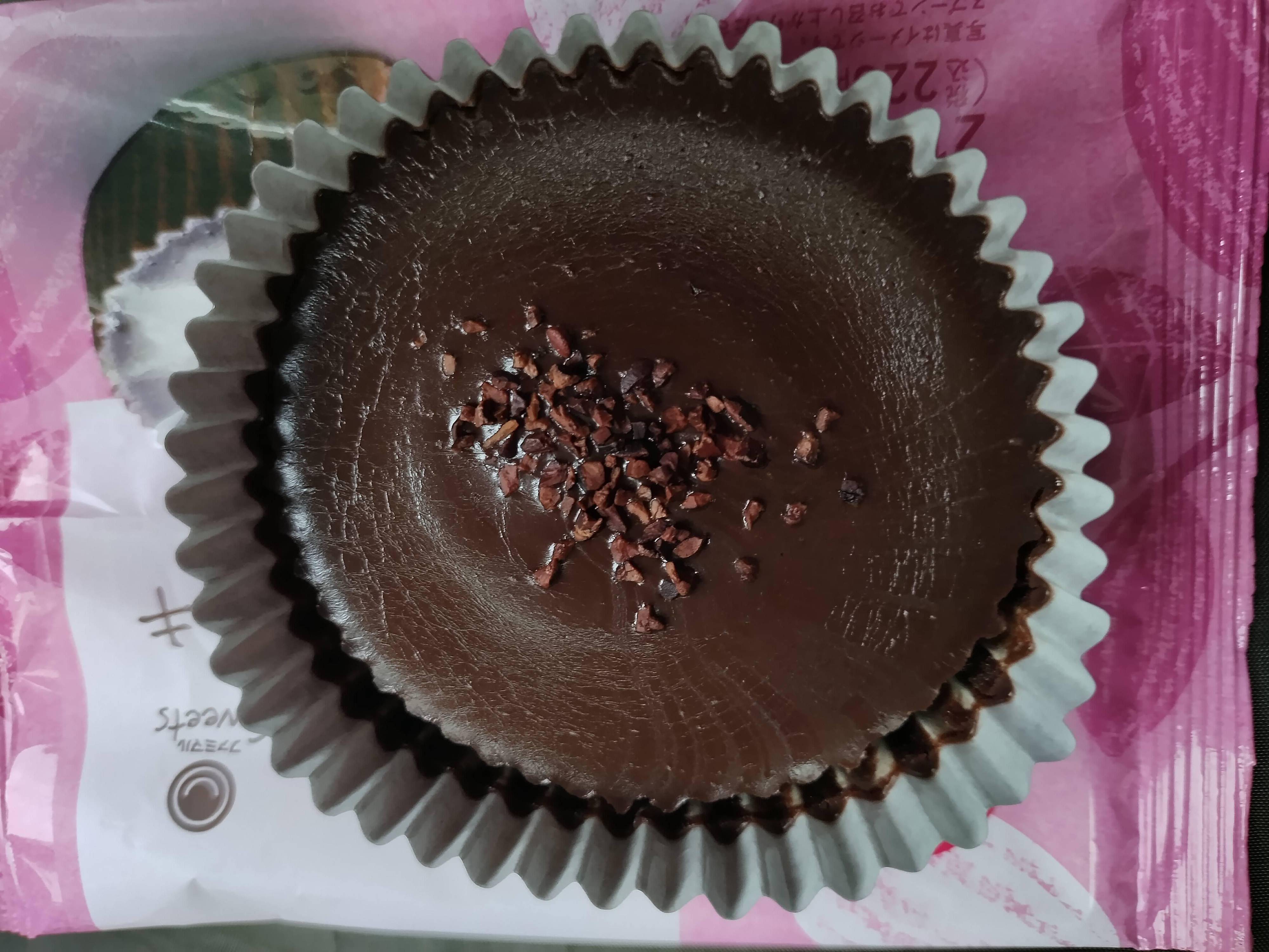 まず1つ目はファミリーマートで見つけた「濃厚なめらかショコラケーキ」。お値段は税込228円です。封を開けた瞬間、チョコレートの香りがふわっと広がります。一口食べると、チョコテリーヌのような濃厚さが口いっぱいに広がります。原材料をみると、小麦粉が使われていませんでした。チョコレート感がとても強いケーキです。