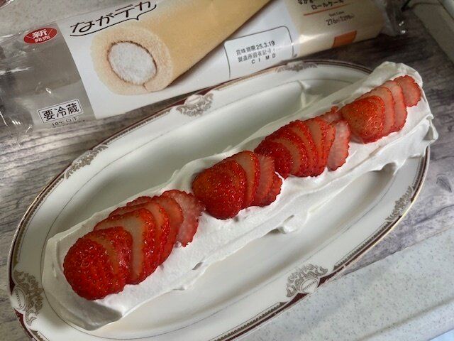 さらに、この時期なのでいちごを飾ってみました!すると一気に豪華に。おもてなしのテーブルにもピッタリのロールケーキが完成しました!