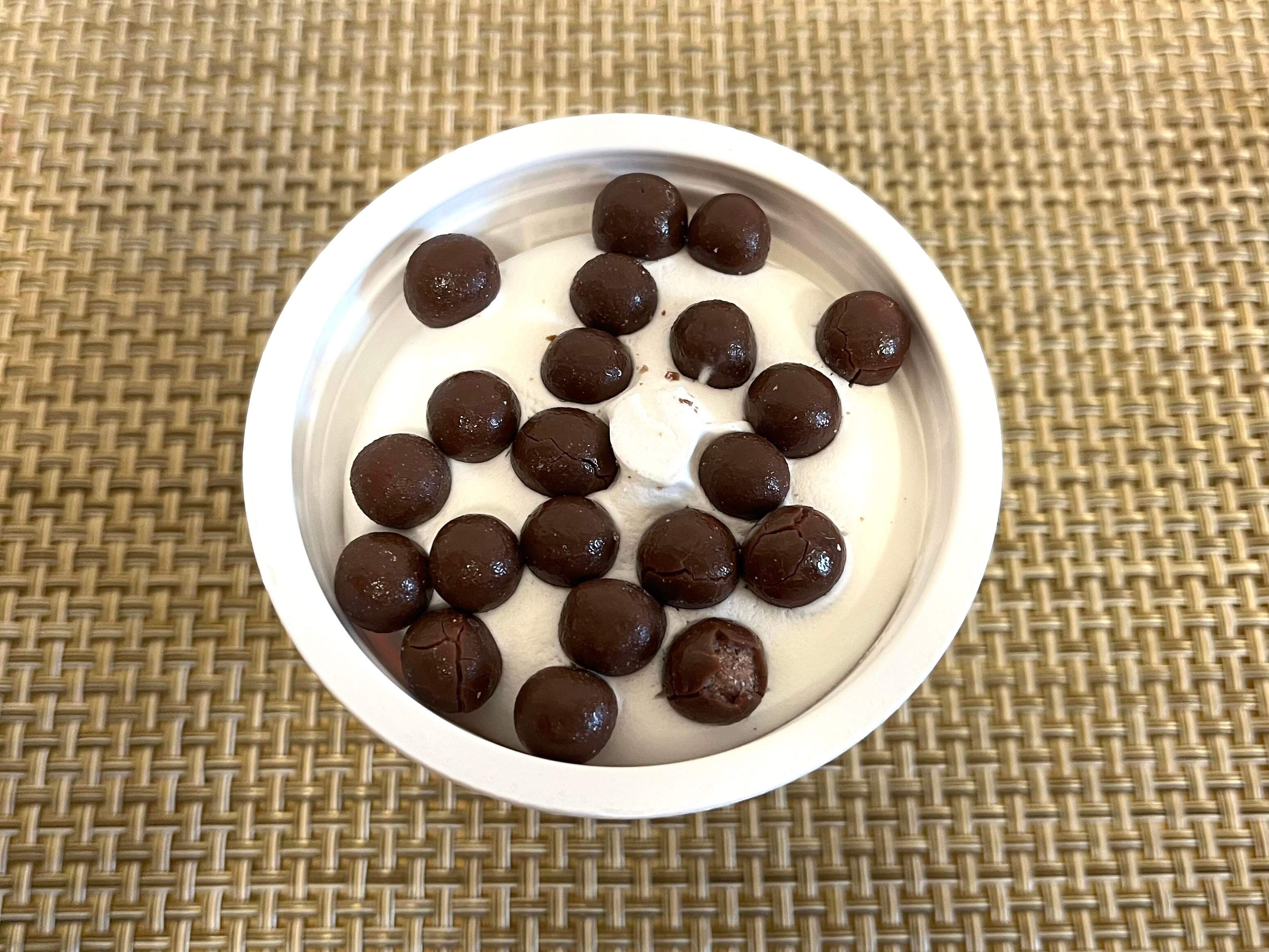 蓋を開けると、まず目に入るのがたくさんのチョコレートボール。ヨーグルトアイスの上に、たくさんトッピングされています。