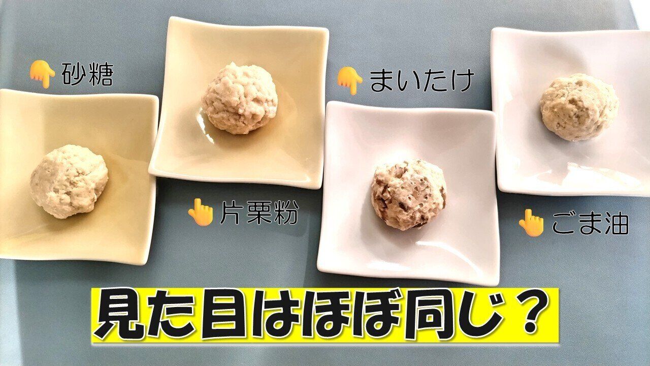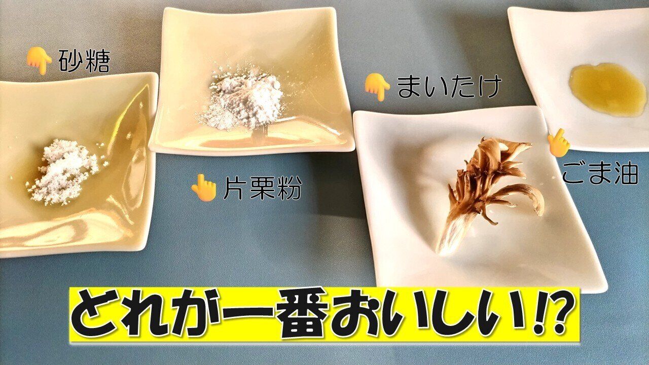 筆者自身は、片栗粉、ごま油、まいたけの順で気に入りましたが、小学生の娘にも同時に食べ比べてもらったところ、ごま油、砂糖、片栗粉の順に。