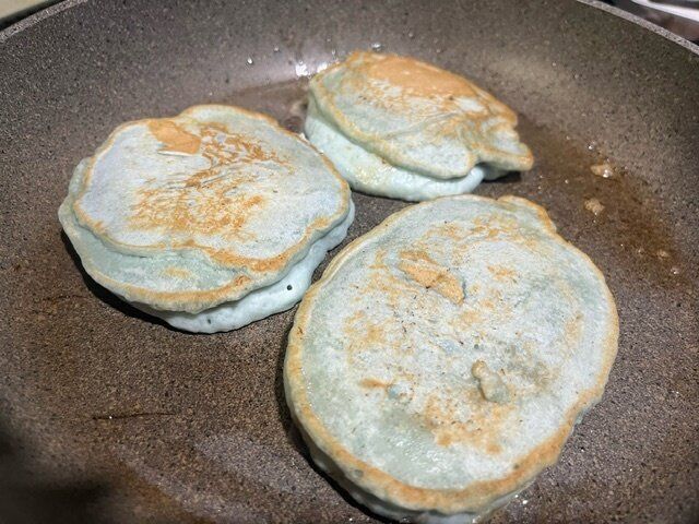 水と混ぜるだけなのに、ブルーのパンケーキが焼ける!