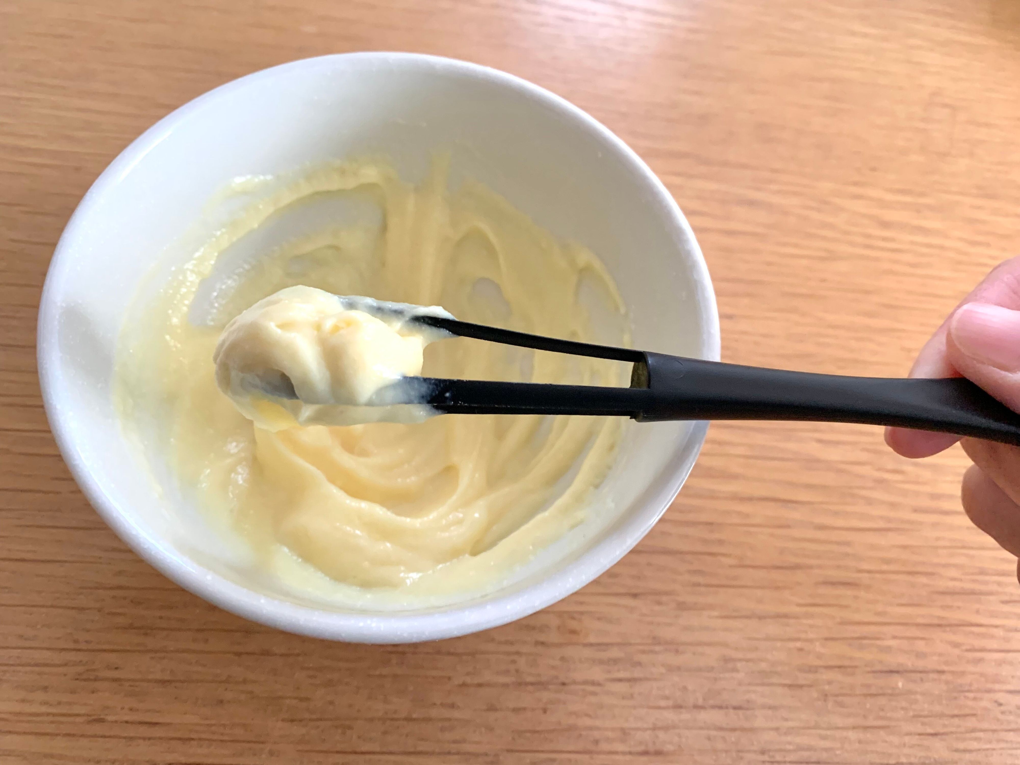 カスタードクリームミックスに冷たい牛乳を入れ、約2分混ぜる。