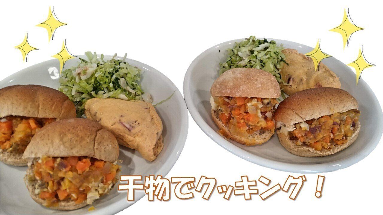 マッシュポテトのつくり方……ゴロゴロと切ったさつまいも・にんじん・玉ねぎ、少々の薄切りにんにくをひたひたの水でやわらかく煮ます。それらの水気を切って潰したところへ、骨ごと食べやすい小さめの塩干しした干物を刻み、こしょうと一緒に混ぜてパンにはさむだけ。