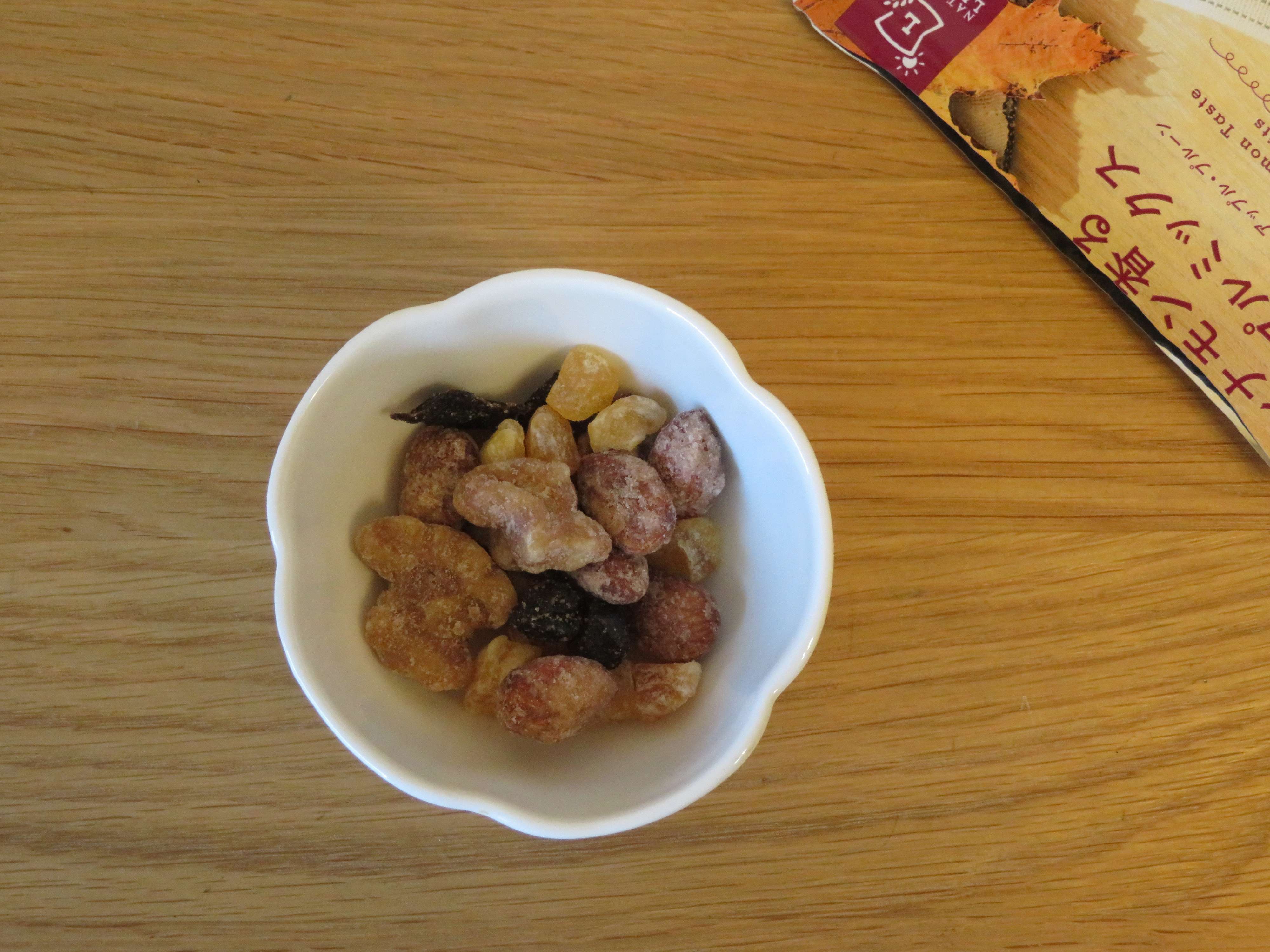 アーモンド・クルミ・リンゴ・プルーンの4つの素材が入ったナッツとドライフルーツのミックスです。