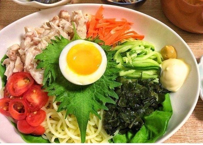 サラダチキンとたっぷりのお野菜で、簡単に豪華な冷やし中華が作れます◎