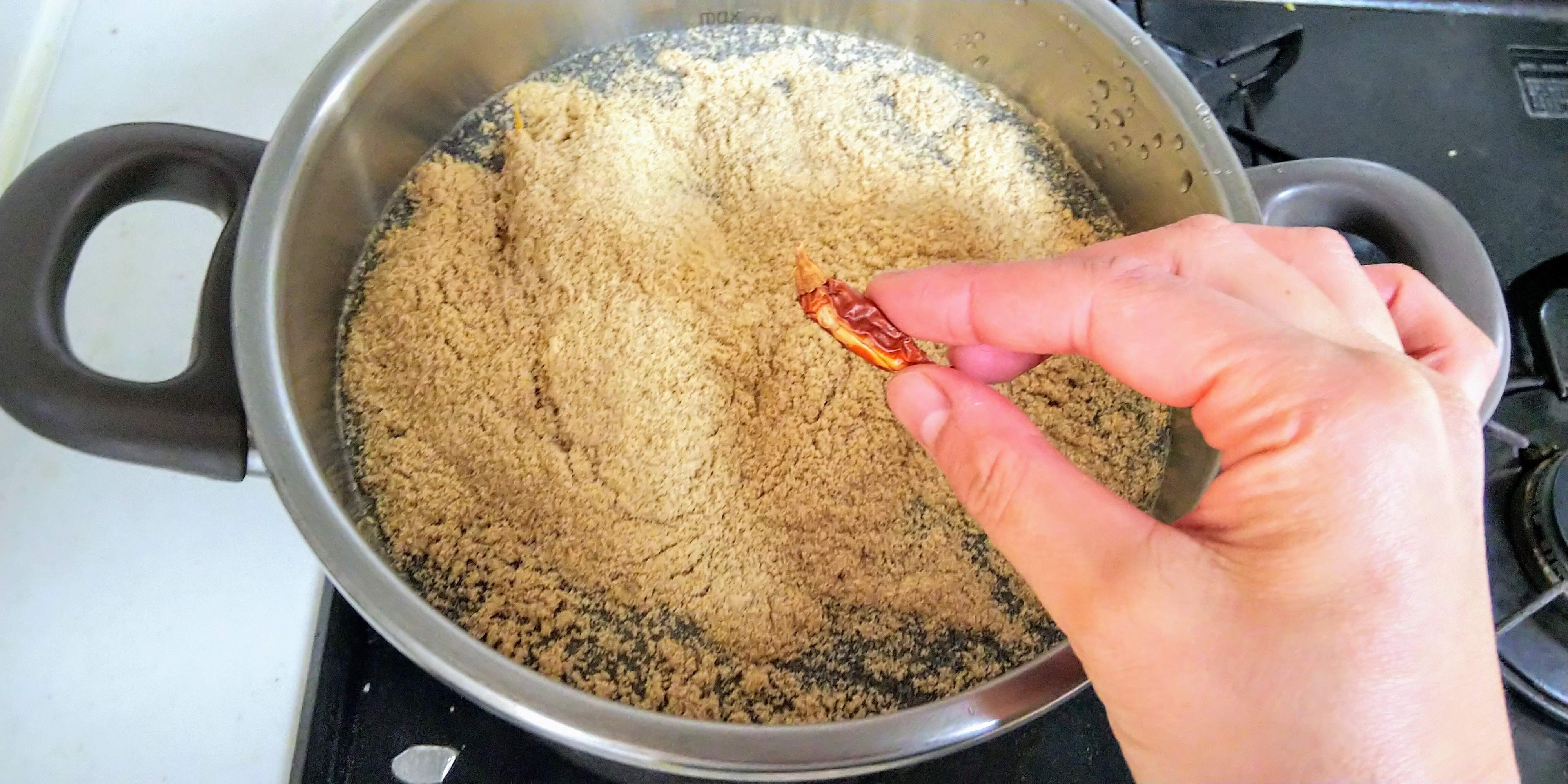 4、たっぷりの水(必ずかぶるくらい)を入れたお鍋にたけのこを入れてから、米ぬかと唐辛子を順に入れる
