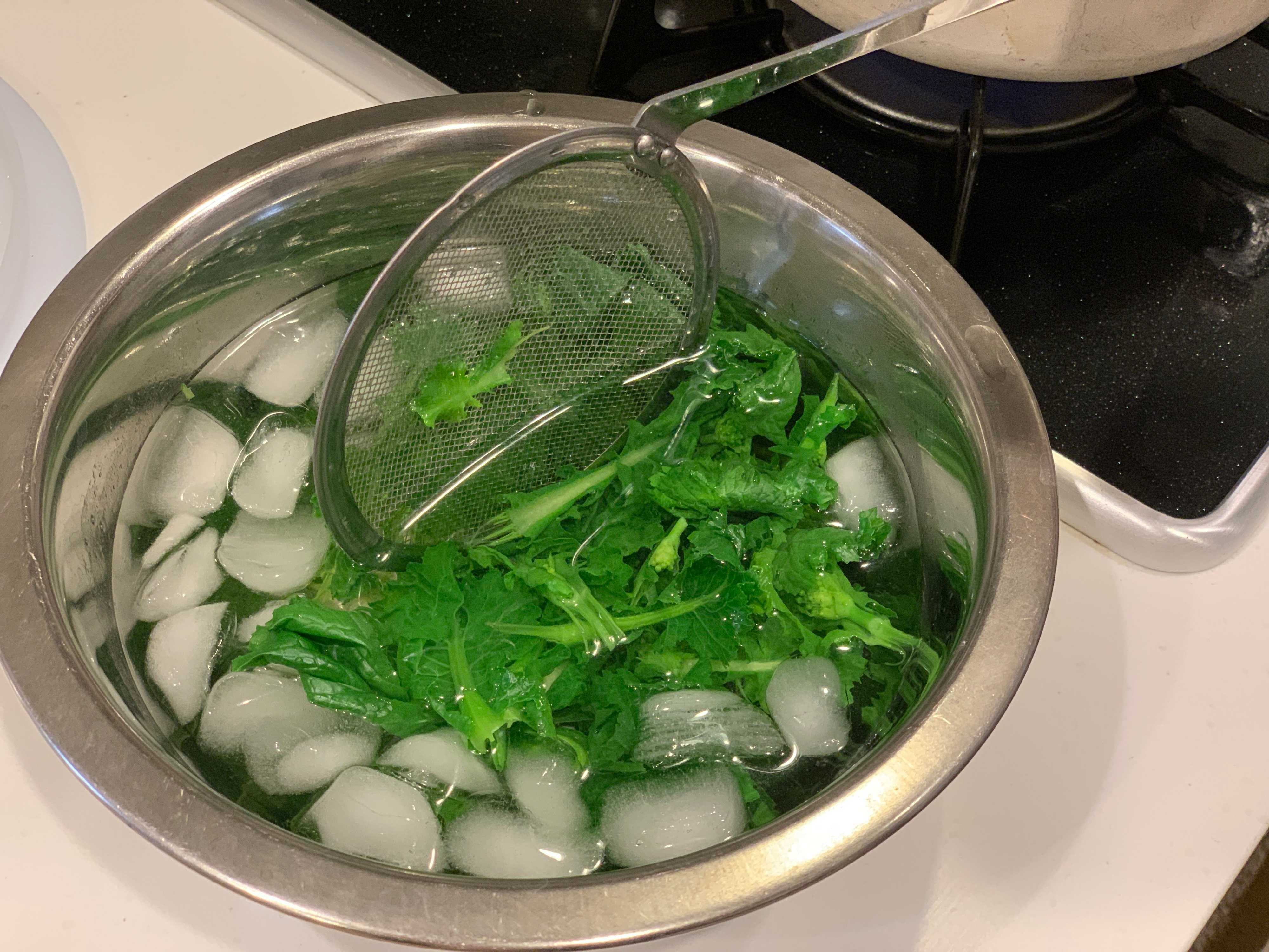 はじめから氷を張った水を用意しても、熱々の菜の花を入れるとあっという間にお湯になってしまうので、一度水に晒したらその水をすぐに取り替え、そのあとに氷水につけると菜の花がすばやく冷えて食感がよくなるのだそう。