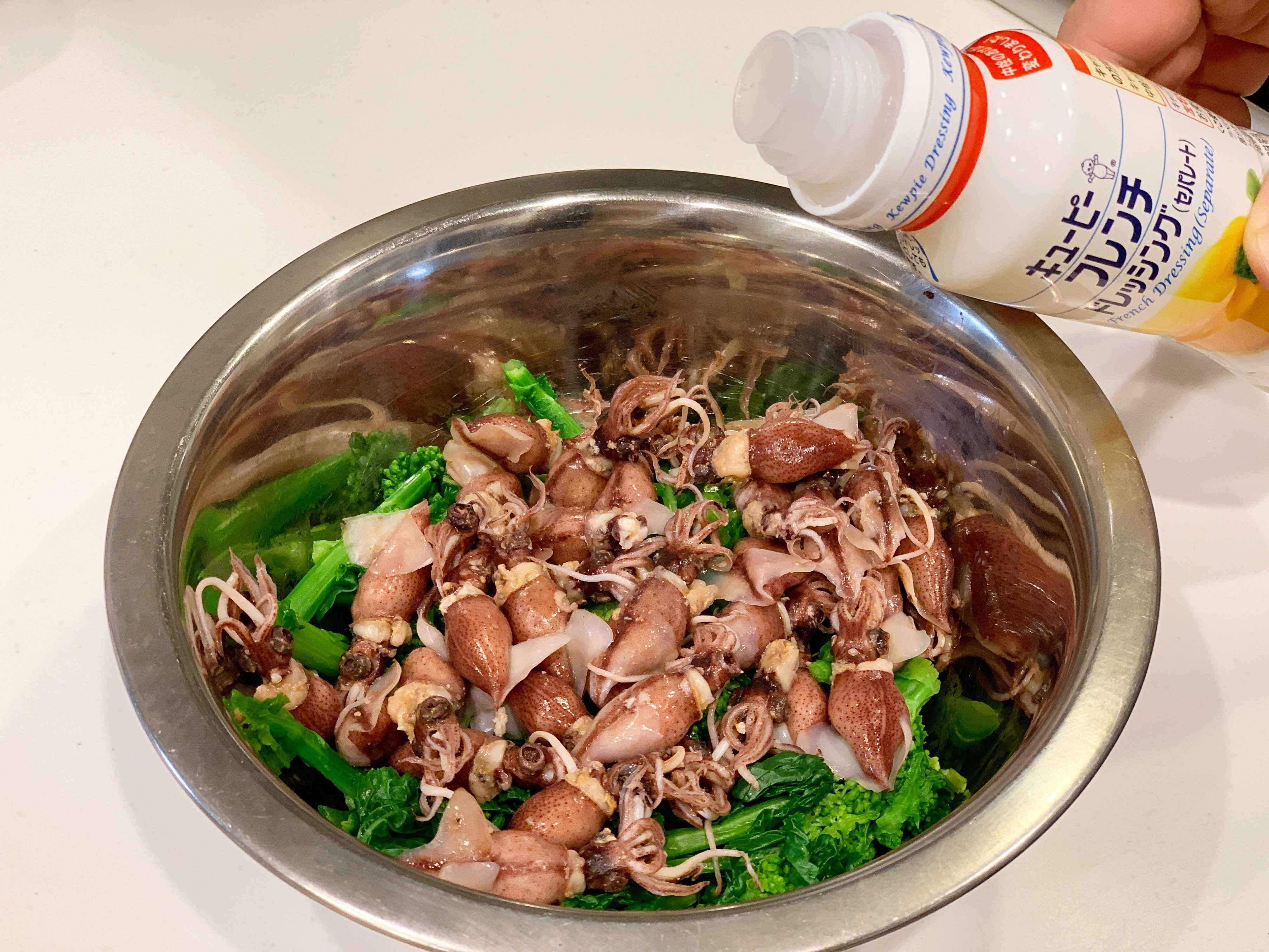 菜の花とほたるいかをボウルへ入れて、ドレッシングで和えれば完成です。