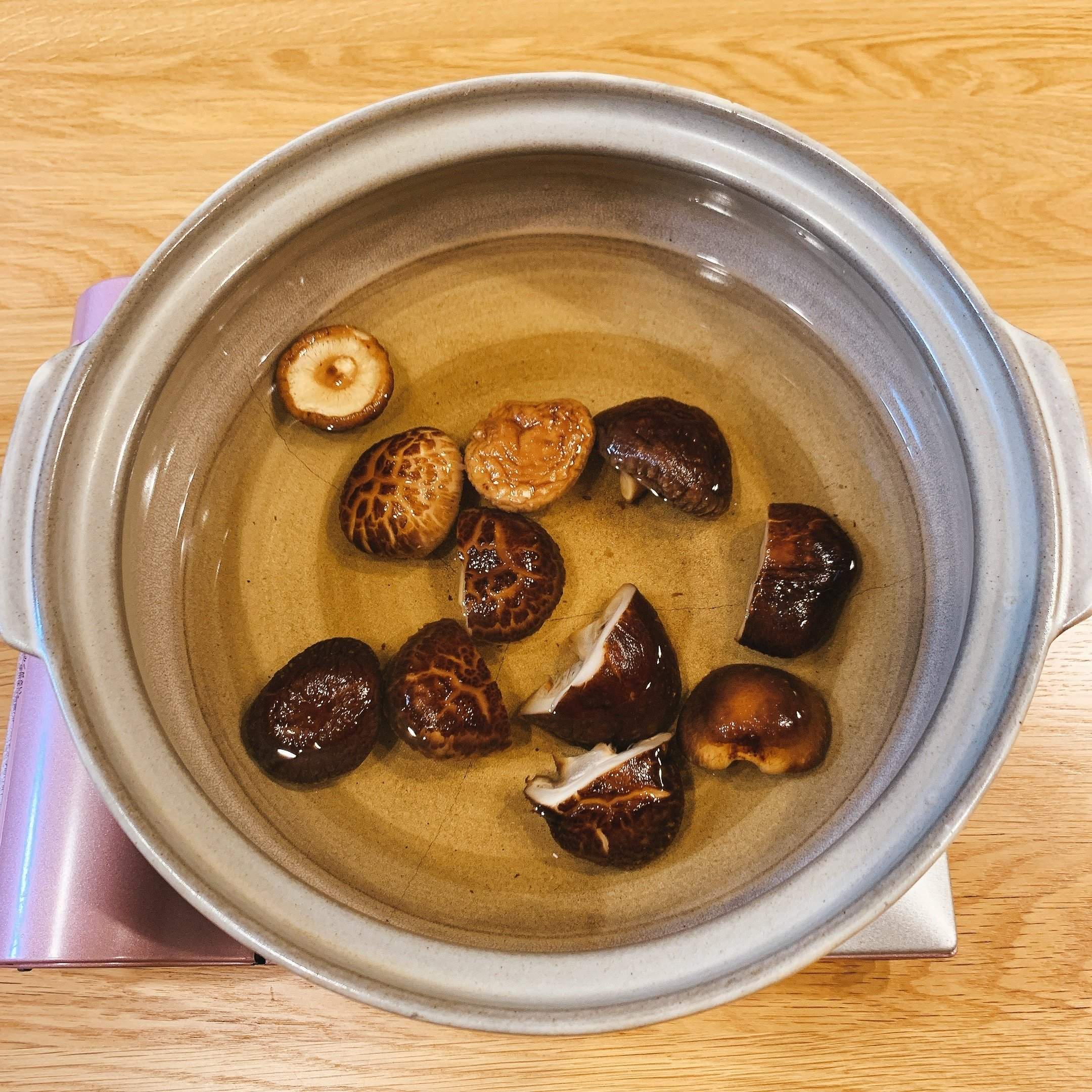 1. 一晩水に浸けて戻した干ししいたけを食べやすい大きさに切り、戻し汁と一緒に鍋に入れます。