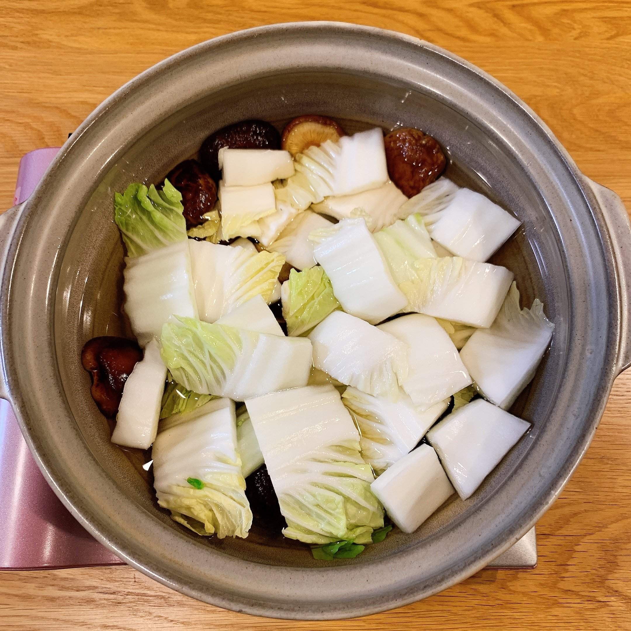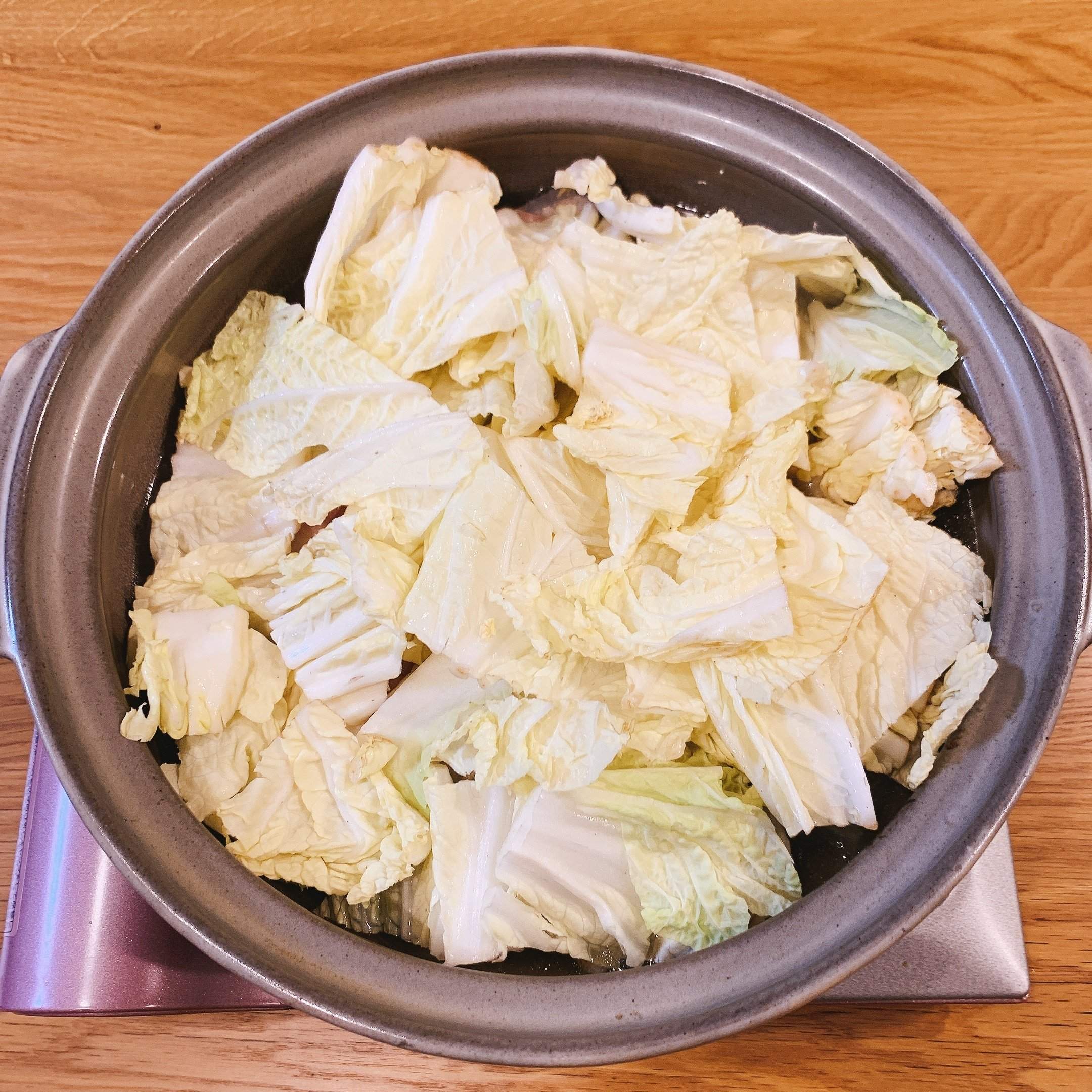 5.残りの白菜を山盛りに入れ、弱火で白菜がクタクタになるまで待ちます。