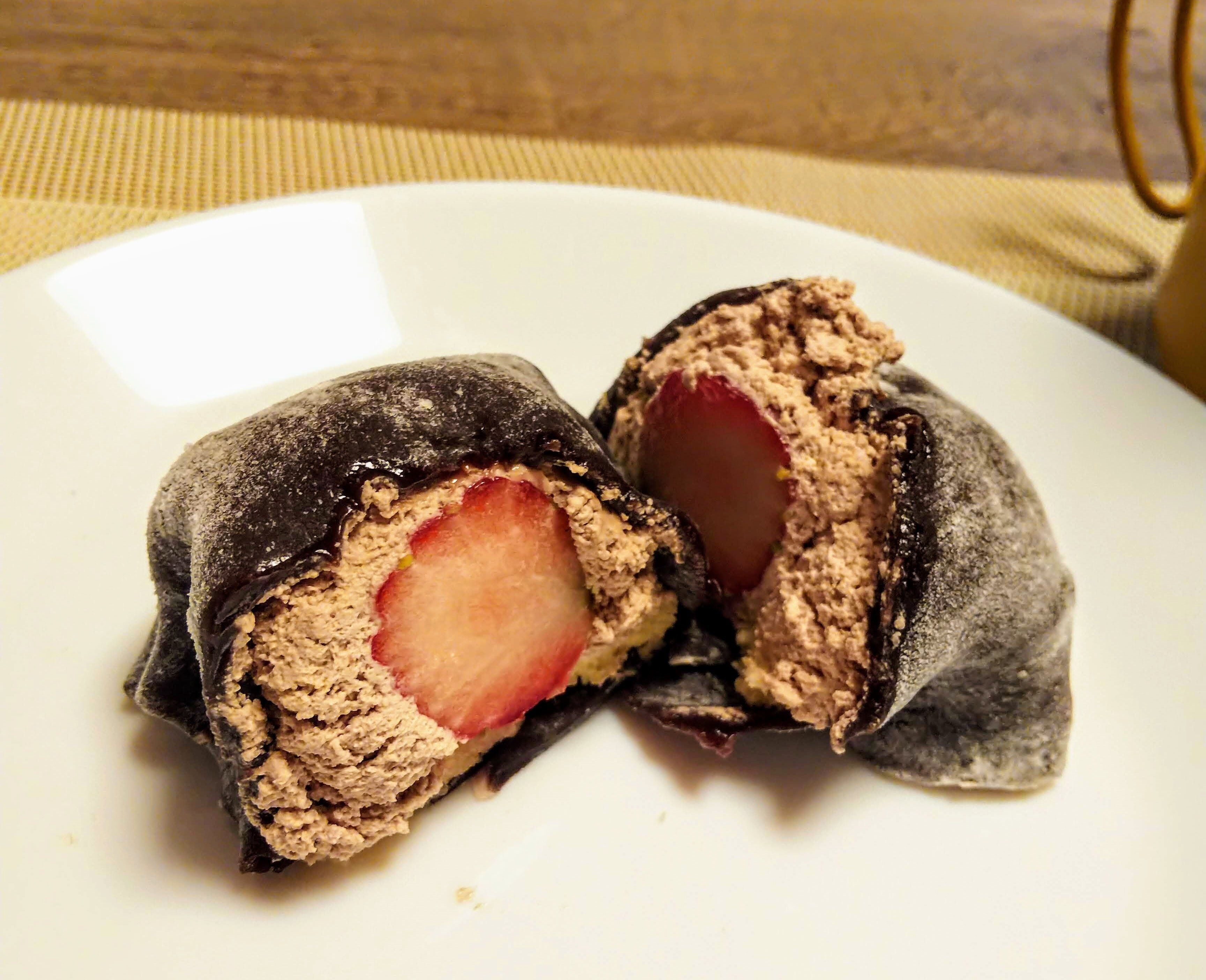 今回紹介するチョコレートバージョンは茶色というよりは黒色に近い求肥にチョコレートホイップと苺が入っているもの。中の苺は白バージョンと変わらず大きくて食べ応えがあります。