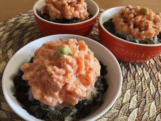 私と子供たちの昼食にサーモンたたき丼を作りました。作ったと言っても、のせるだけで超簡単♪