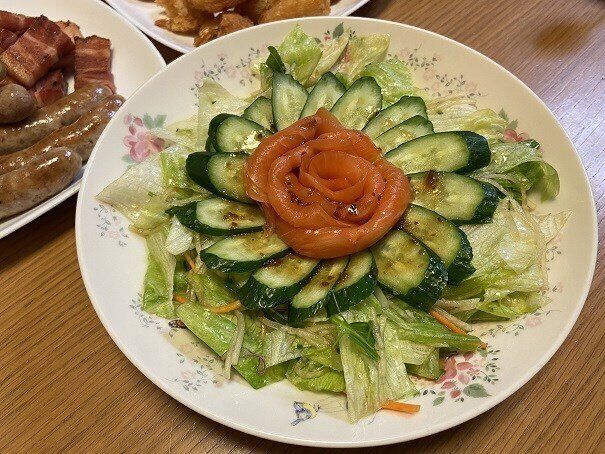 サラダの中央にサーモンを薔薇の形にトッピングしてみました。