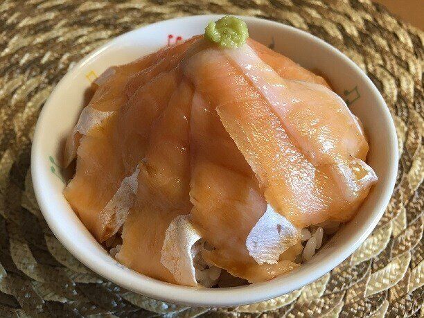 お醤油をまわしかけわさびをトッピングしたら立派なサーモンハラス丼の完成です。