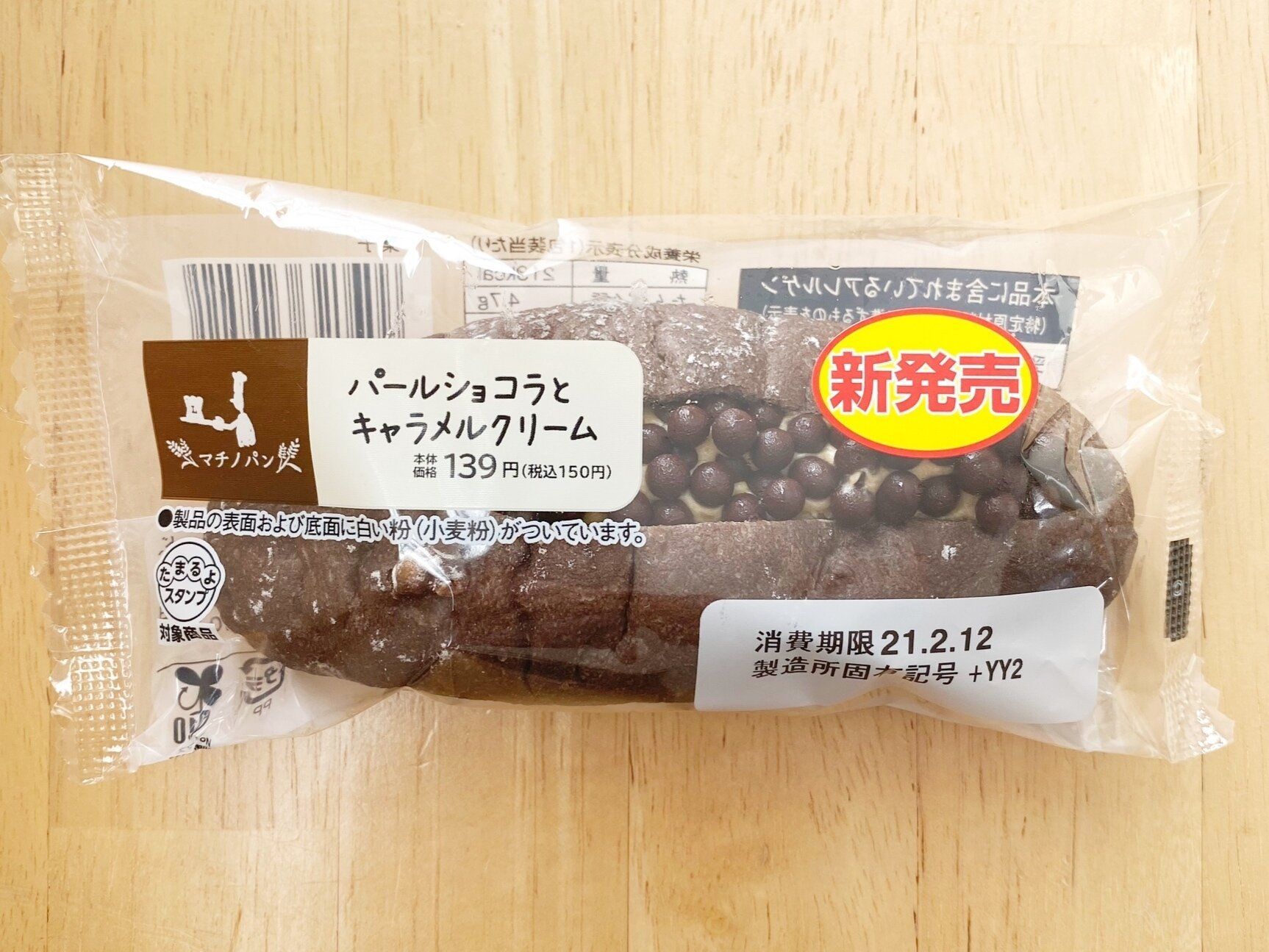 チョコクリームとくるみを練り込んだパン生地に、キャラメルクリームをサンドし、フランス産パールショコラをトッピングした商品。213kcal、150円(税込)。