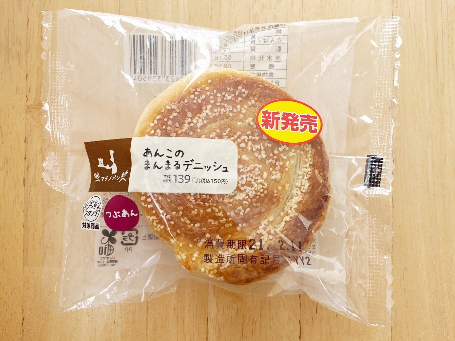 しっとりもっちりとしたバターの香り広がる生地に、粒あんをたっぷりサンドしたデニッシュあんぱん。369kcal、150円(税込)。