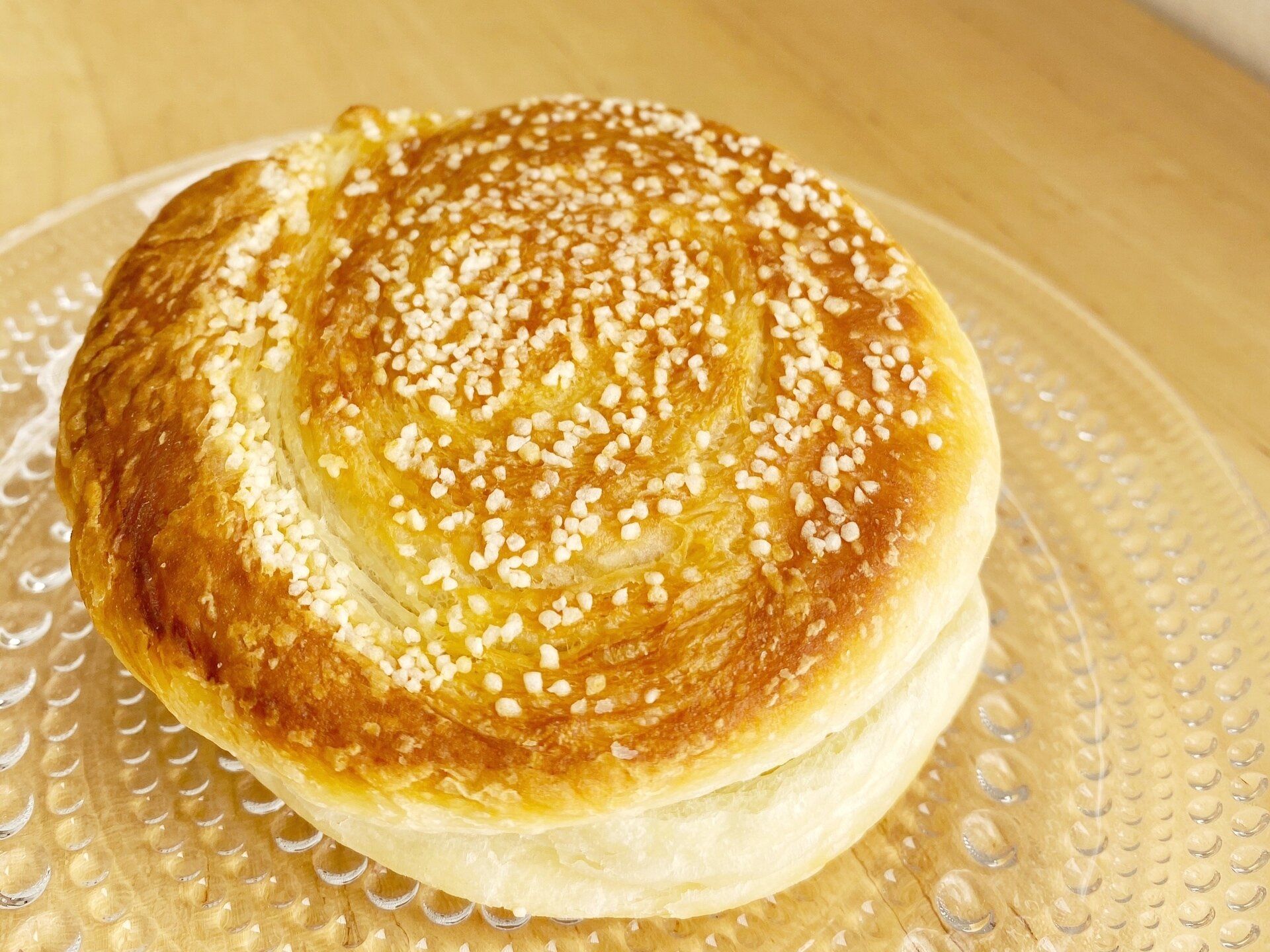 生地の表面にトッピングされているしんびき粉がシンプルな見た目のアクセントになっています。持ち上げるとズッシリと重さがあり、デニッシュ生地に練り込まれたバターの良い香りがします。