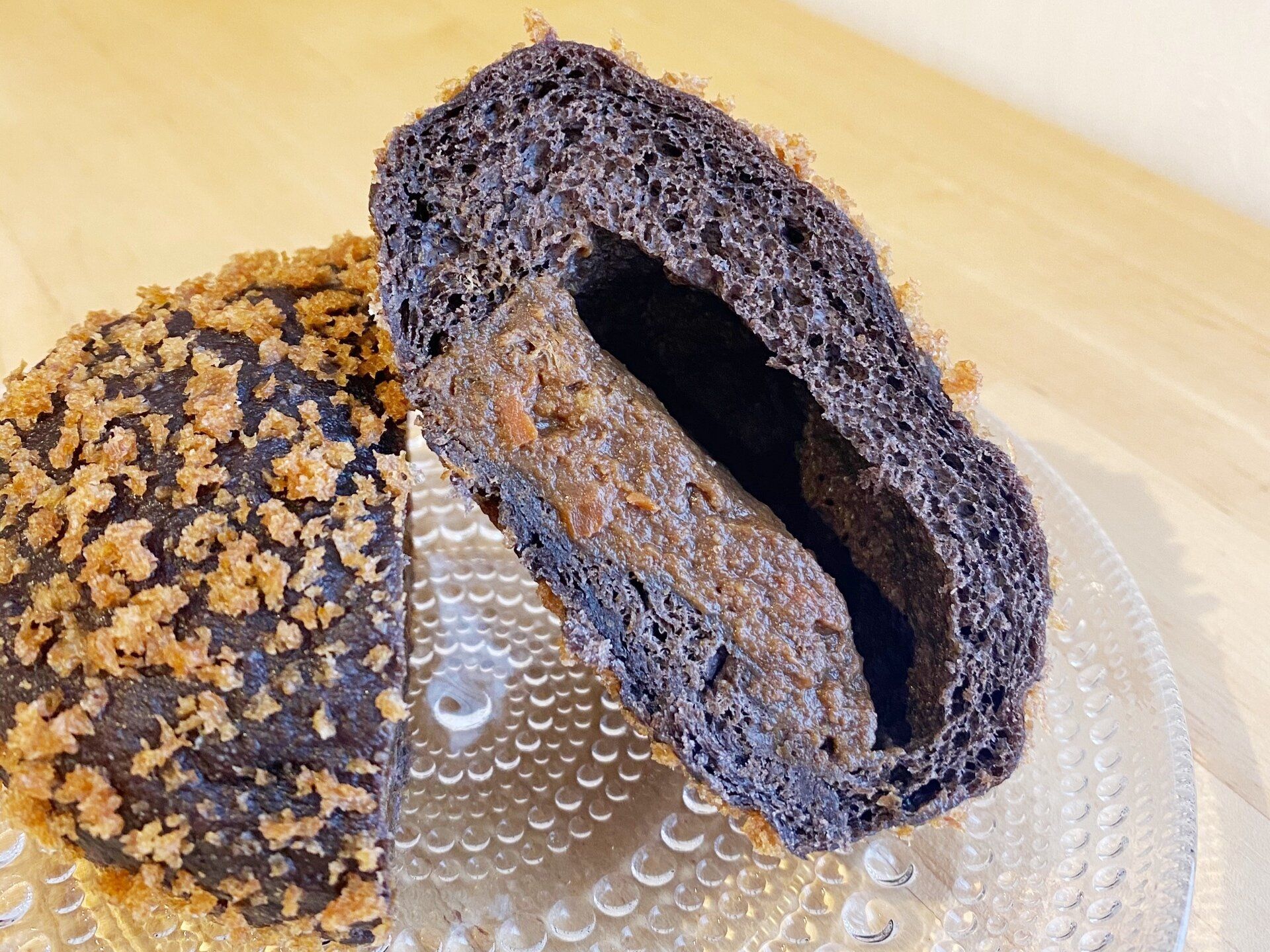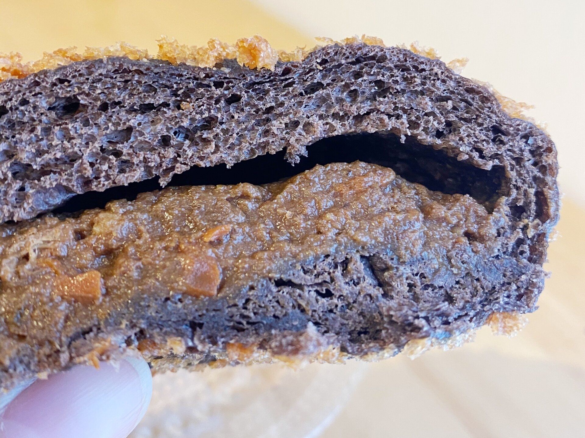 ココア入りのパン生地のまわりにはこんがり揚がったパン粉、見た目はおいしそうなスイーツのようにも見えます。