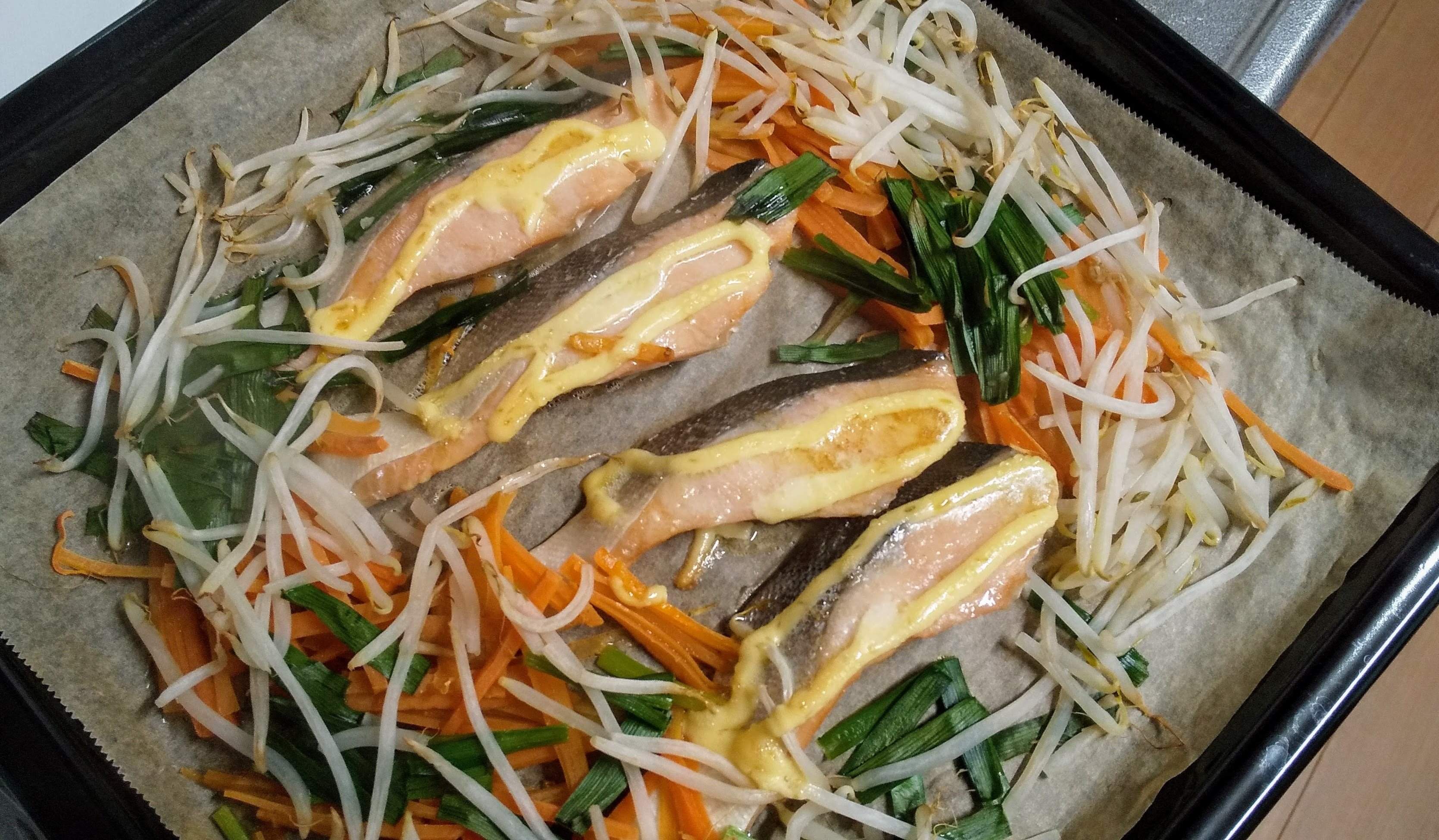 写真の通り、火が通りやすいように野菜を切って、魚と一緒に天板に並べるだけ。