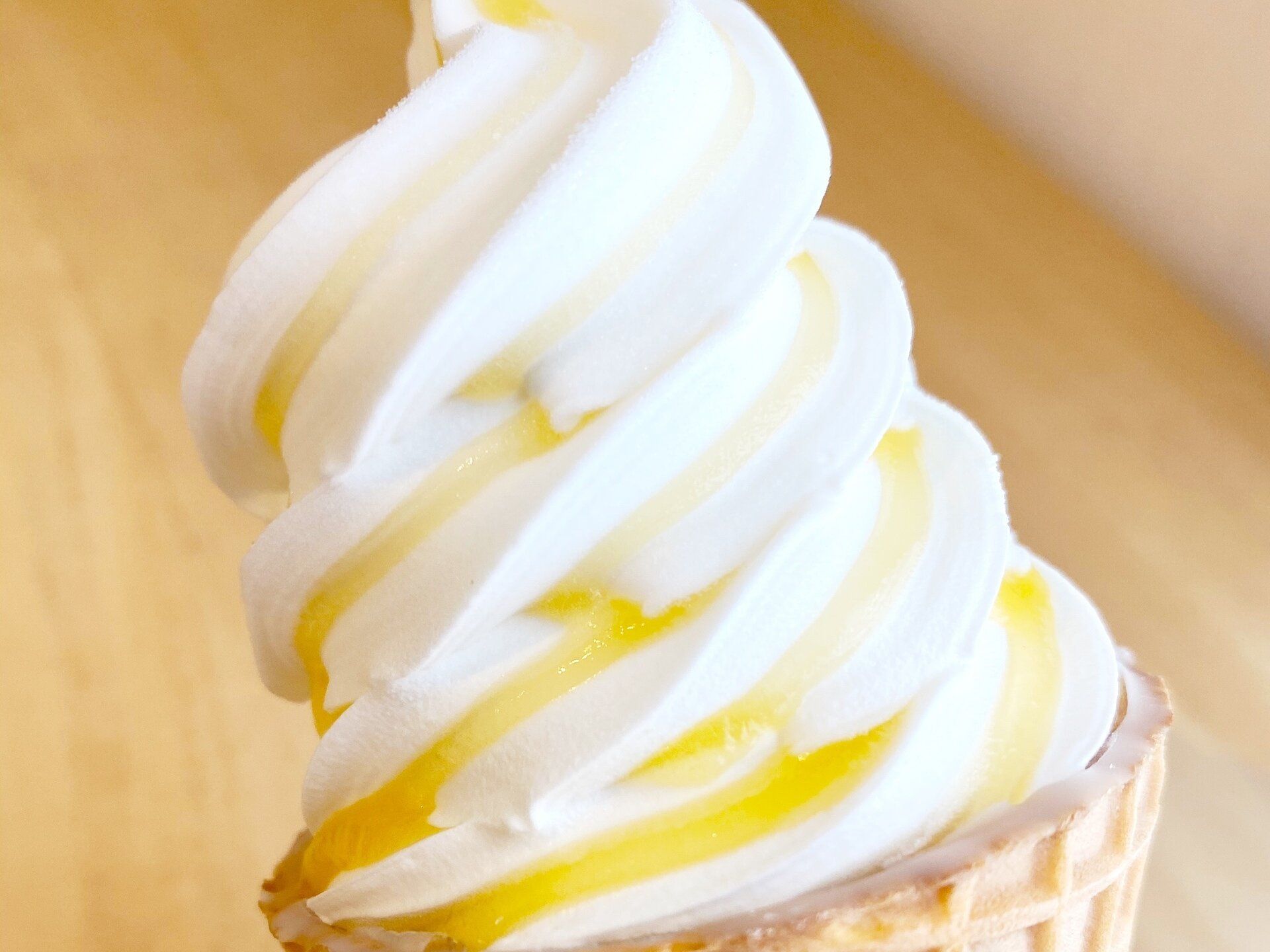 PABLOのチーズタルトを思わせる、黄色いアプリコットソースが真っ白のアイスと共にらせん状に巻かれています。