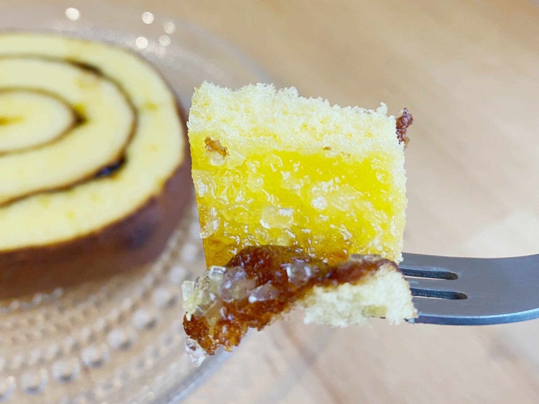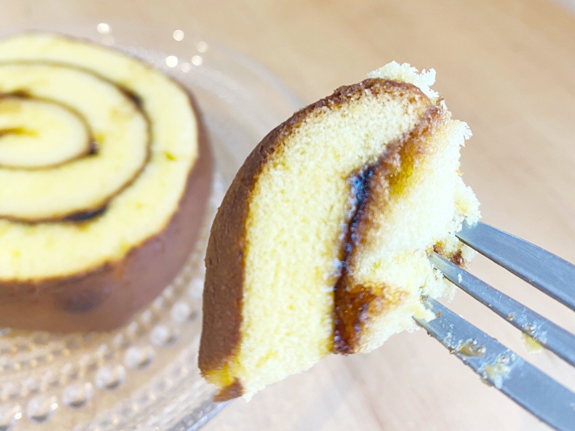 一般的なロールケーキよりやや大きめサイズで厚みも2.5センチほどあります。慎重に持ちあげないとクシャッと潰れてしまうほどふわふわで柔らかいスポンジ生地の中には、カスタードクリームとカラメルソースが巻き込まれています。