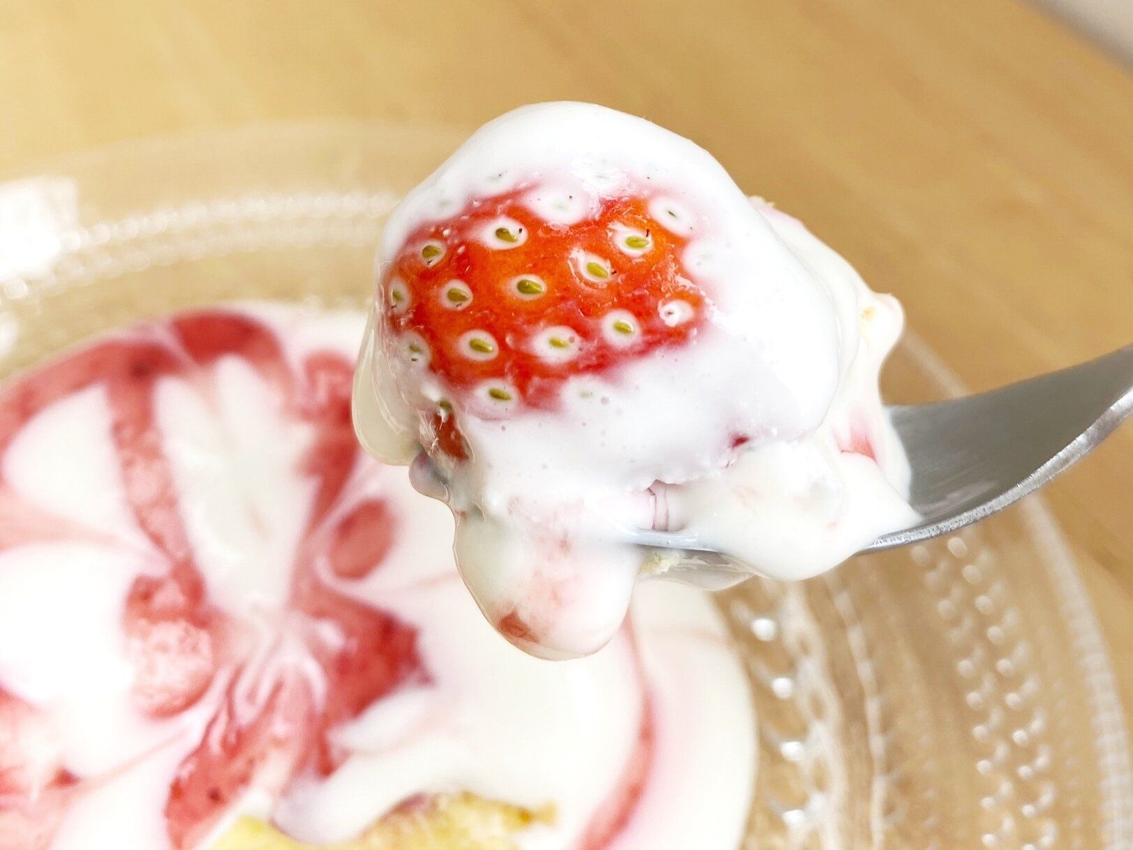 外側のミルククリームは甘くてミルキーな味わいです。いちごソースの甘酸っぱさと相まって、思わず『う〜ん』と唸ってしまうほどおいしい!