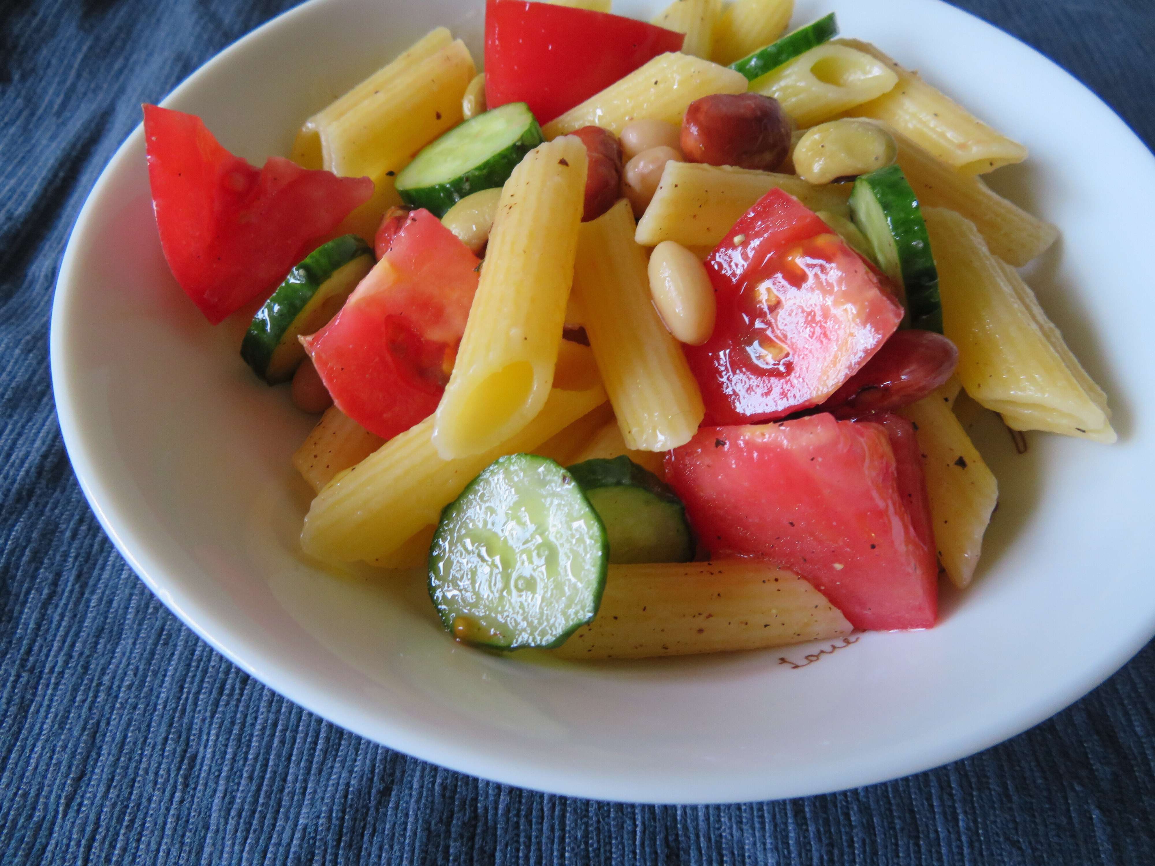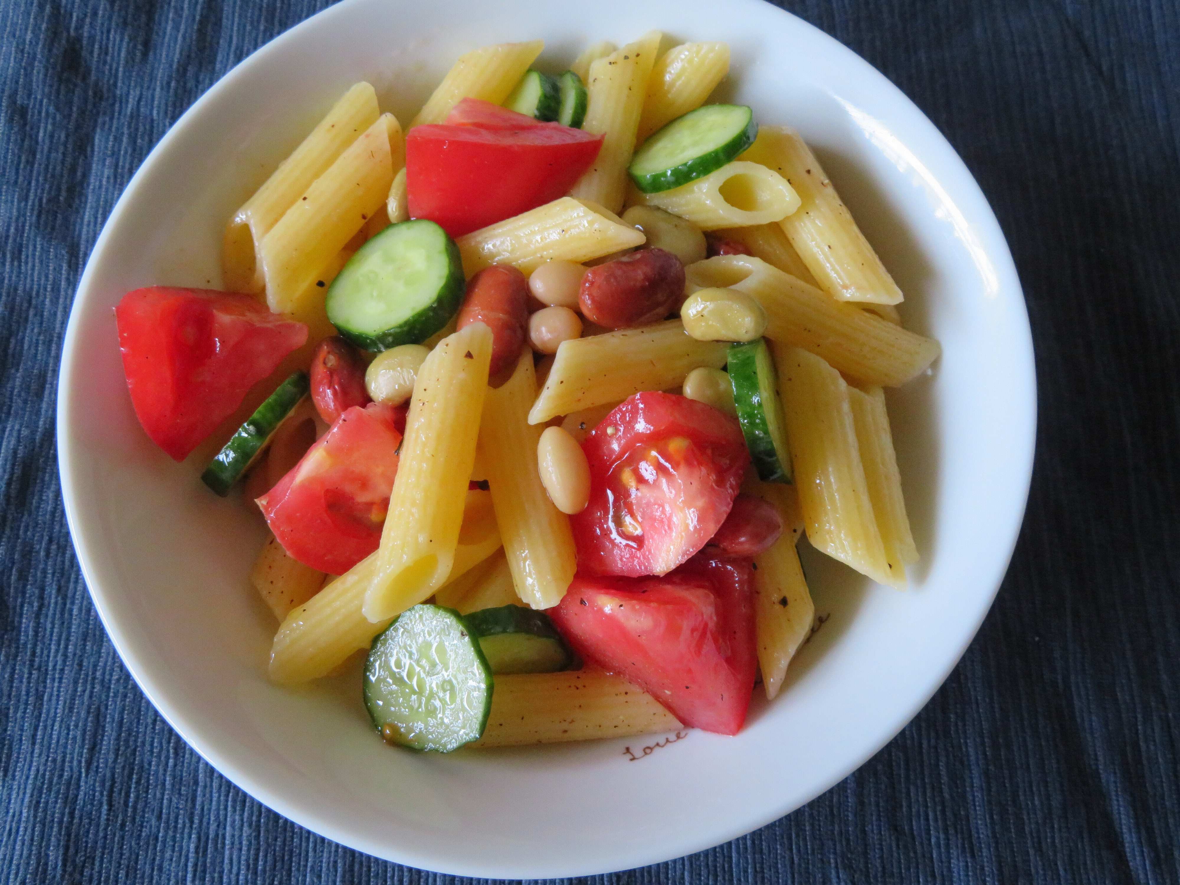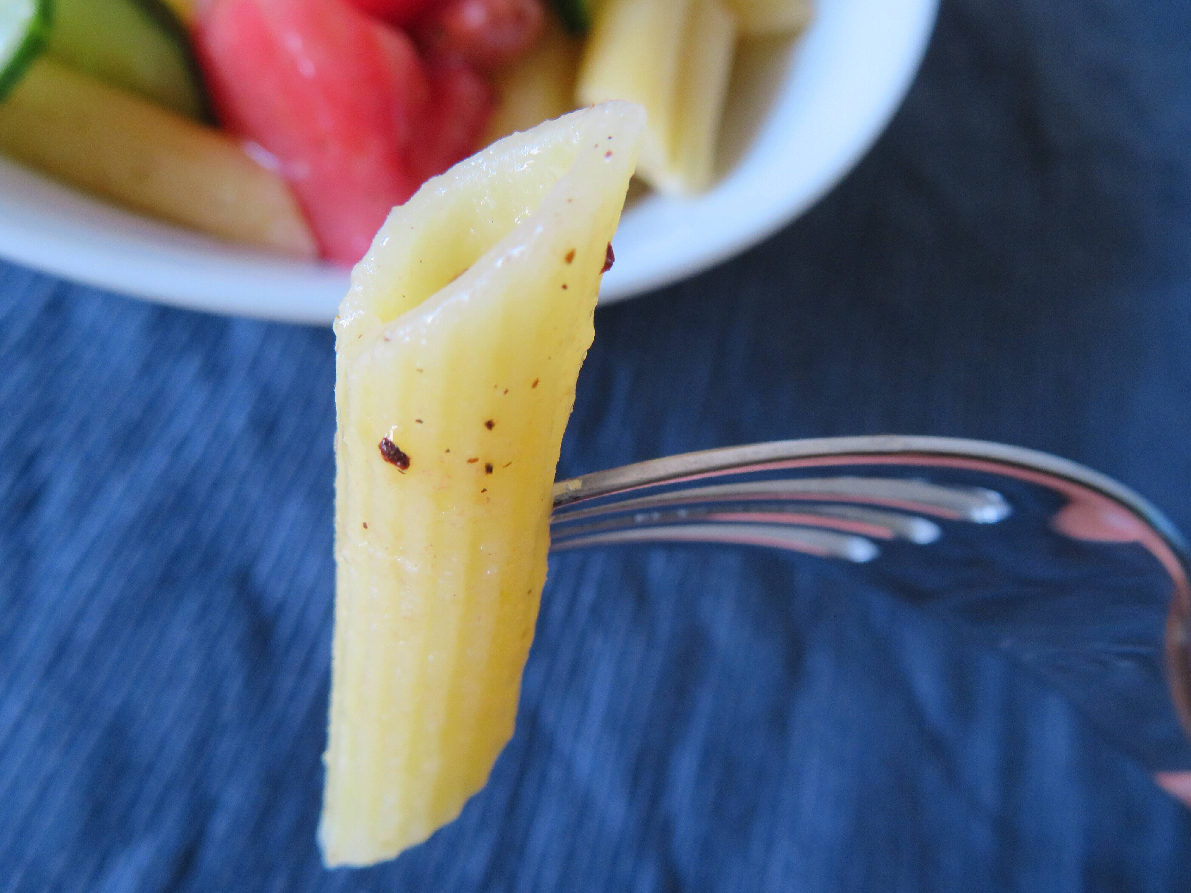 ペンネはオリーブオイル、レモン汁、塩コショウで和えてサラダに。