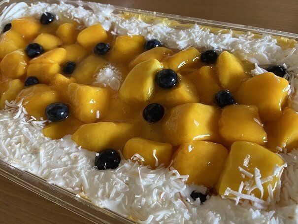 スポンジにマンゴームース、ホイップ、ココナッツ、フレッシュなマンゴーとブルーベリーがたっぷりのった見た目も華やかなケーキです。