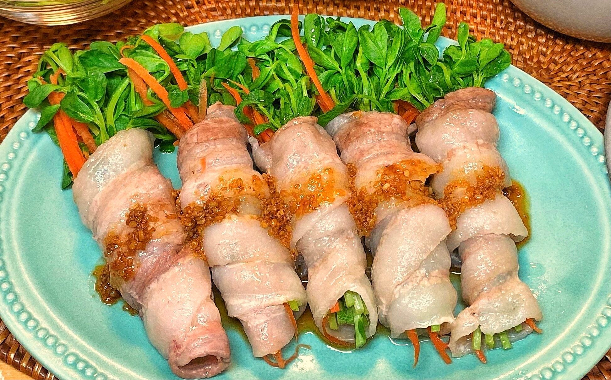 1.根本を切り落とした豆苗と、細く切った人参を豚バラ肉で巻く。
