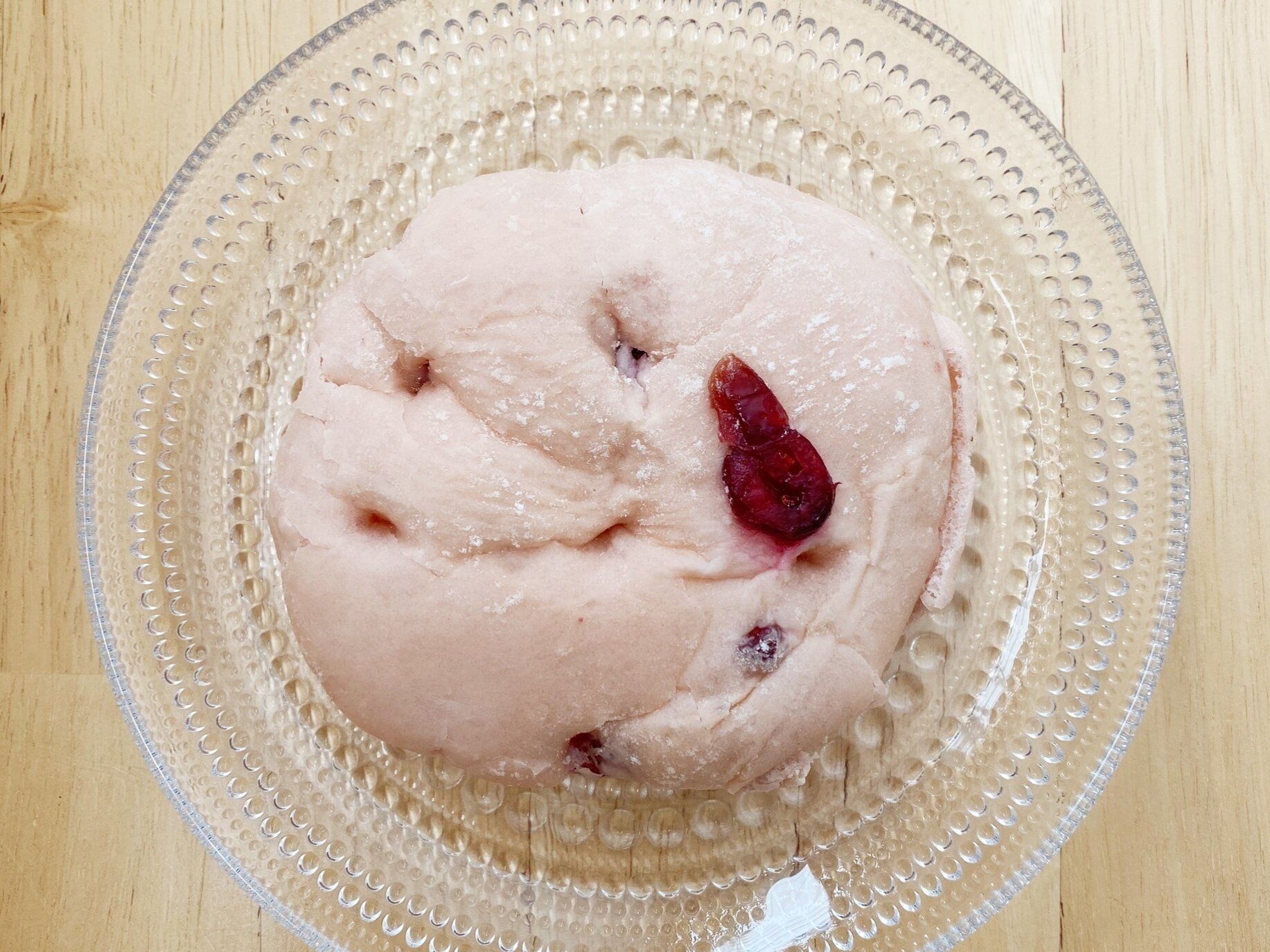 直径約10センチ程のフォカッチャは淡いピンク色で可愛らしい印象。練り込まれているクランベリーが今回はトッピングのように上に乗っていました。
