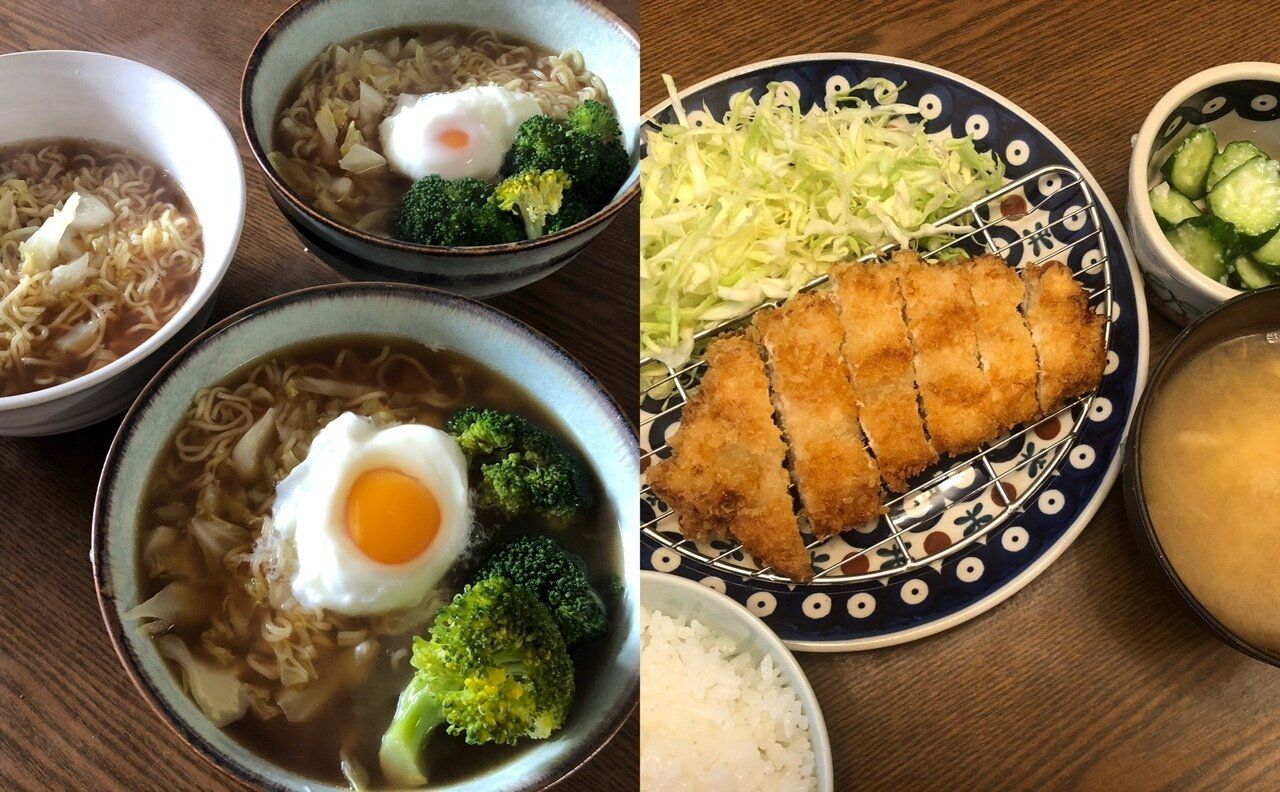買い物をした日のお昼と夕飯です。子ども達のリクエストで昼食はラーメン。夕飯は、鶏むね肉をチキンカツにしました。付け合わせはキャベツ。あとはお味噌汁とキュウリの塩こうじ和えです。チキンカツはたくさん作って冷凍しました。なんせ鶏むね肉が2キロありますからね。