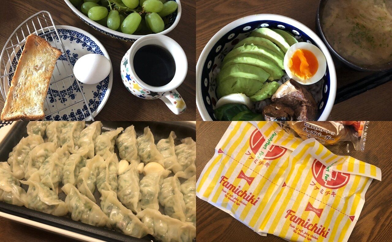 朝食は、トーストとコーヒーとゆで卵。だいたいそれが基本の朝食です。この日は前日に買ったブドウも。子ども達はヤクルトも飲んだり、私は小松菜とバナナでジュースを作ったり、夫は牛乳をヨーグルトメーカーでヨーグルトにしたものを食べたりもしています。