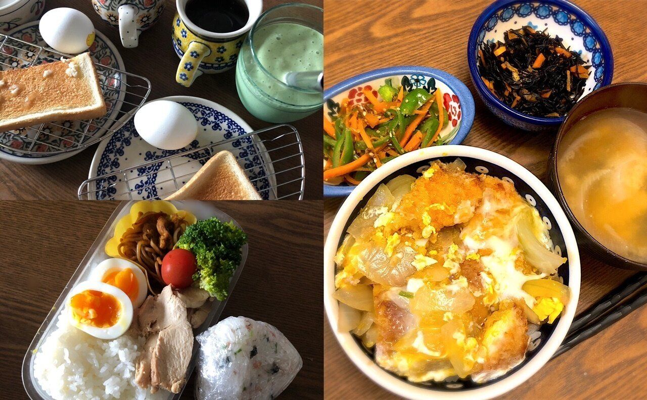 この日は月曜日。朝はいつものトーストとゆで卵を中心に小松菜バナナジュースも。お昼はお弁当を持って公園へ行きました(子供と私のお弁当写真を撮り忘れてしまい、写真は夫のお弁当です。同じような中身でした)夕飯は、たくさん作って冷凍しておいた鶏むね肉のチキンカツを使ってカツ丼。買い置きしてあったひじきでひじき煮と、ピーマンと人参のおかか炒め、味噌汁でした。
